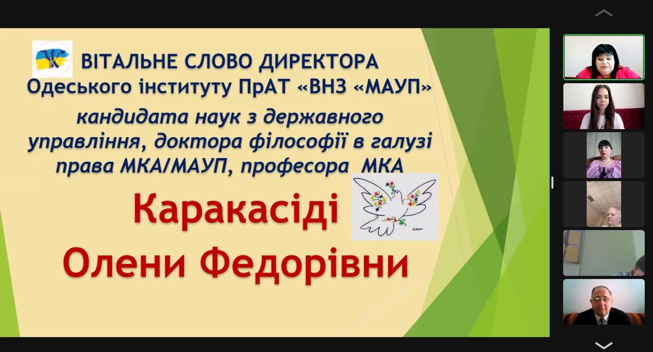 До учасників пленарного засідання звернулась директор Одеського інституту МАУП к.н.з держ упр., доктор філ.в галузі права Олена Каракасіді. В пленумі виступив к.ю.н., доцент, проф.МКА, зав.каф.правових дисциплін Одеського інституту В.М.Пьохов з актуальною та емоційною доповіддю "Жахлива війна РФ з Україною: її пагубні наслідки для екології та економіки світу". Д.філос.н., доцент, зав.каф.загальнонаукових, соц.та поведінкових дисциплін Одеського інституту А. О. Нерубасська проаналізувала системні концепти психологічних служб під час війни в Україні. Великий інтерес і жваву дискусію викликав виступ мол.наук.співробітника Науково-дослідного центру індустріальних проблем розвитку НАН України О.В.Шпілевського на тему: "Місце фундаментальних засад Плану Маршалла у повоєнному економічному відновленні України".