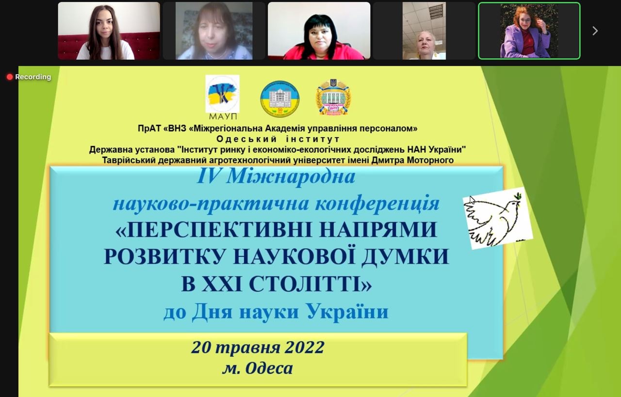 20 травня 2022р. на базі Одеського інституту МАУП відбулася щорічна IV Міжнародна науково-практична конференція до Дня науки України "Перспективні напрями розвитку наукової думки в ХХІ столітті", підготовлена разом з ДУ "Інститут ринку і економіко-екологічних досліджень НАН України" та Таврійським державним агротехнологічним університетом імені Дмитра Моторного. І хоча цей ЗВО з Мелітополя під окупацією і вимушений перереєструватися в м. Запоріжжя, він залишився серед організаторів - на знак підтримки колег, які вимушено опинились на окупованій території. Одночасно у формі 3-ої секції пройшла Всеукраїнська студентська наукова конференція "Проблеми інтеграції вітчизняної освіти та науки у міжнародний простір".