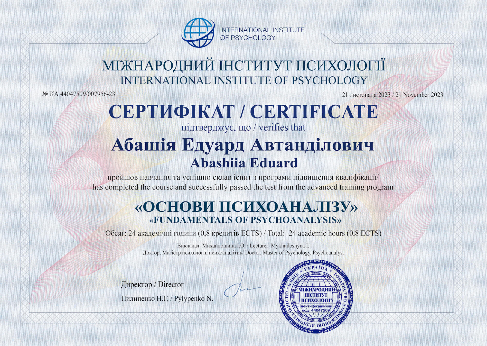 Викладач кафедри психологія, Абашія Едуард Автанділович, успішно пройшов навчання та склав іспит з програми підвищення кваліфікації в Міжнародному інституті психології (м. Київ) на тему "Основи психоаналізу" (обсяг 0,8 кредитів). Здобуті навички та новітні підходи, отримані під час програми підвищення кваліфікації, обіцяють не лише розширити педагогічний арсенал, а й призвести до покращення якості навчання студентів.