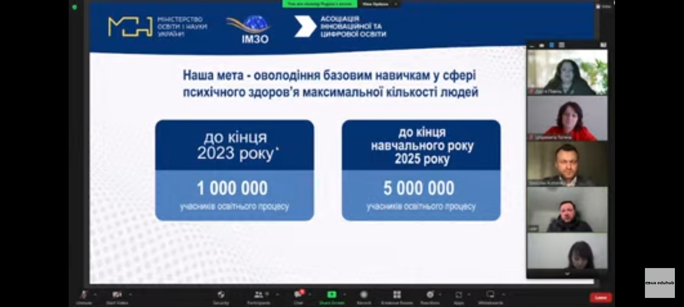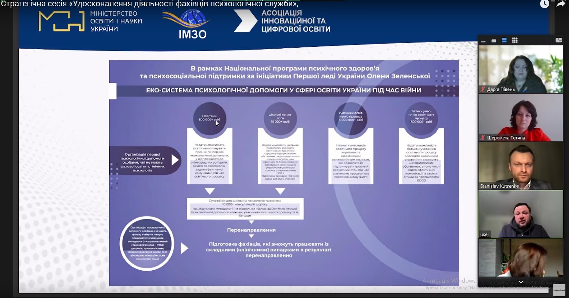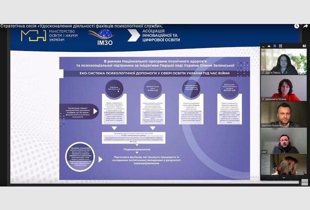 З метою реалізації Національної програми психічного здоров’я, психосоціальної підтримки та за ініціативи першої леді України Олени Зеленської в межах Екосистеми психологічної допомоги у сфері освіти Міністерство освіти і науки України та Державна наукова установа «Інститут модернізації змісту освіти» провели в онлайн-форматі стратегічну сесію «Удосконалення діяльності фахівців психологічної служби» для забезпечення ментального здоров’я учасників освітнього процесу під час військової агресії рф.