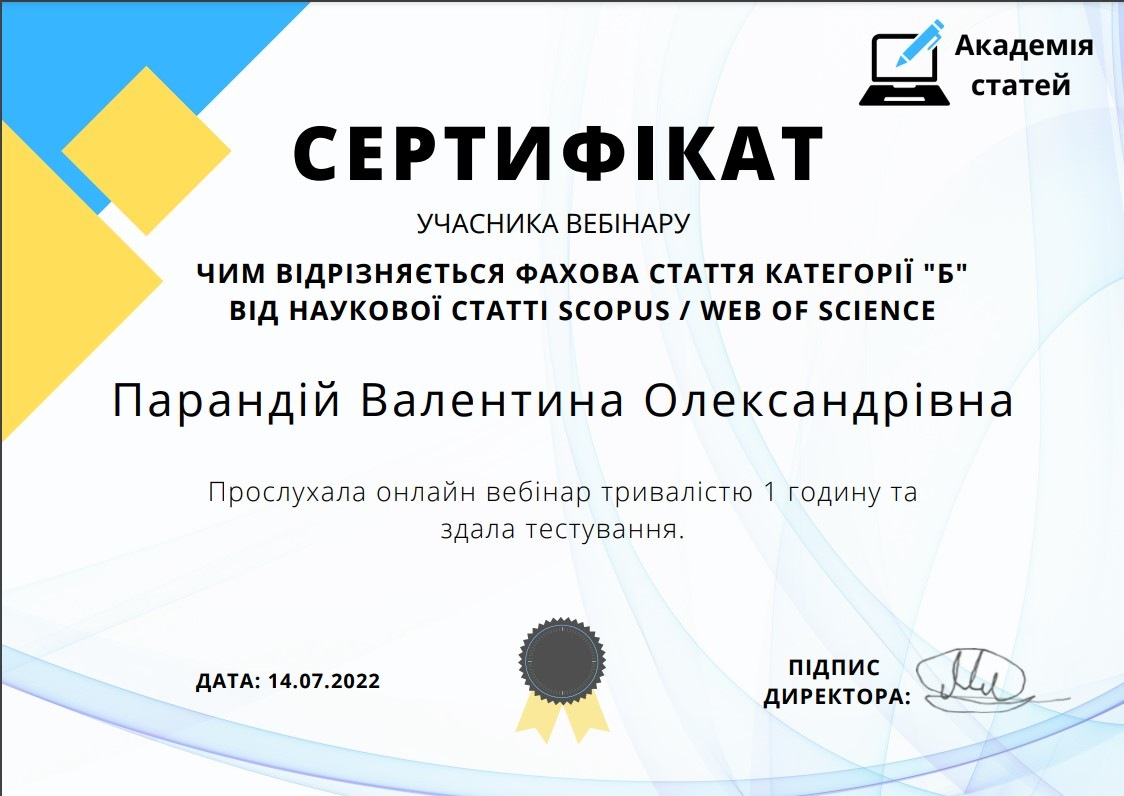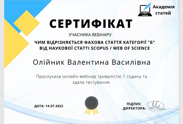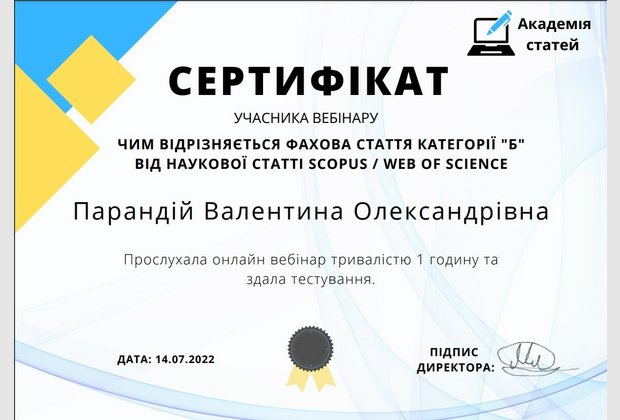Доцент кафедри психології Валентина Олійник та доцент кафедри права та правоохоронної діяльності Валентина Парандій прослухали вебінар «Чим відрізняється фахова стаття категорії «Б» від наукової статті Scopus / Web of Science» і пройшла опитування за темою вебінару. Вебінар для науковців організувала консалтингова компанія «Академія статей».
