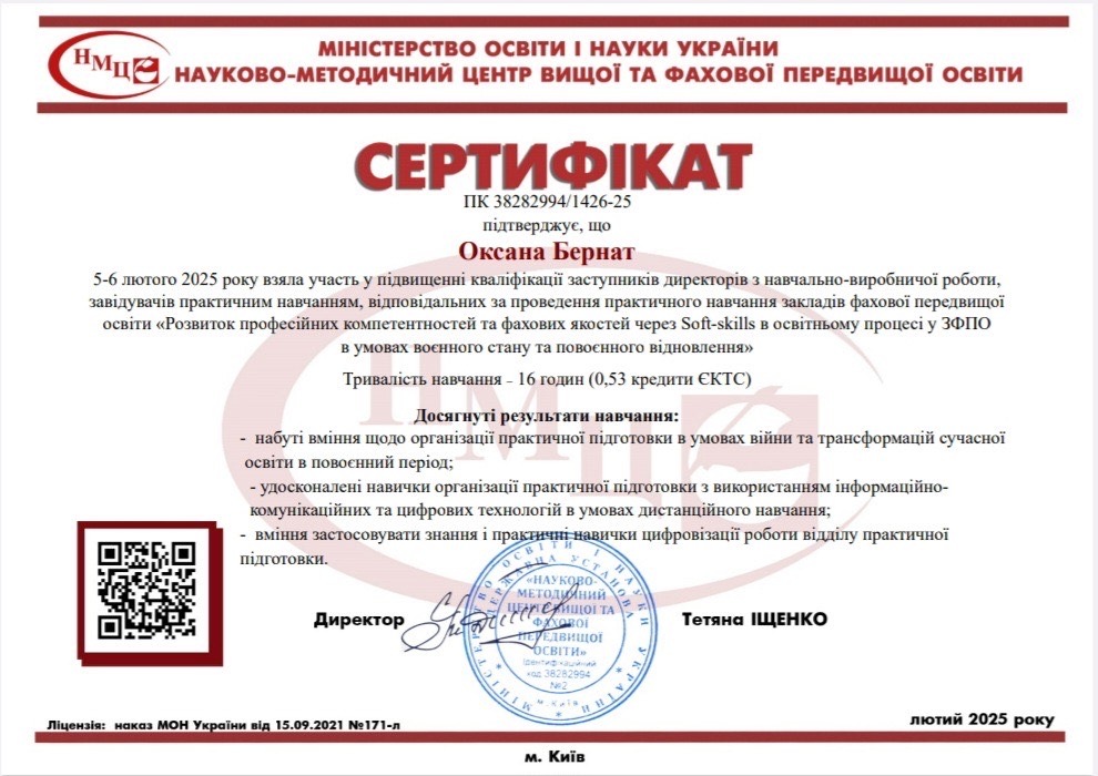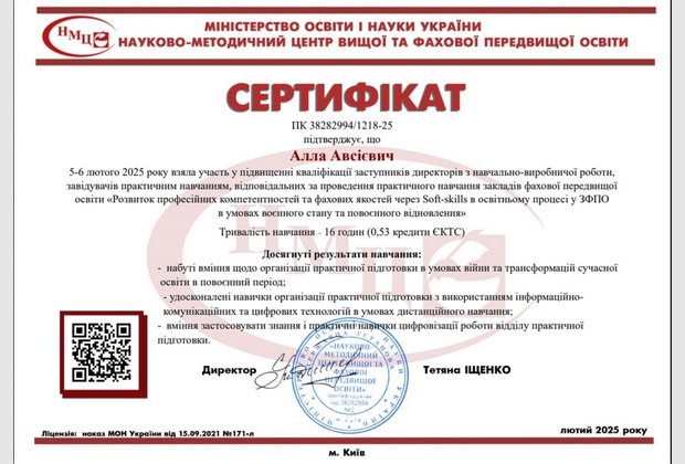 5-6 лютого 2025 року відбулося підвищення кваліфікації відповідальних осіб за проведення практики закладів фахової передвищої освіти «Розвиток професійних компетентностей та фахових якостей через Soft-skills в освітньому процесі у закладах фахової передвищої освіти в умовах воєнного стану та повоєнного відновлення».