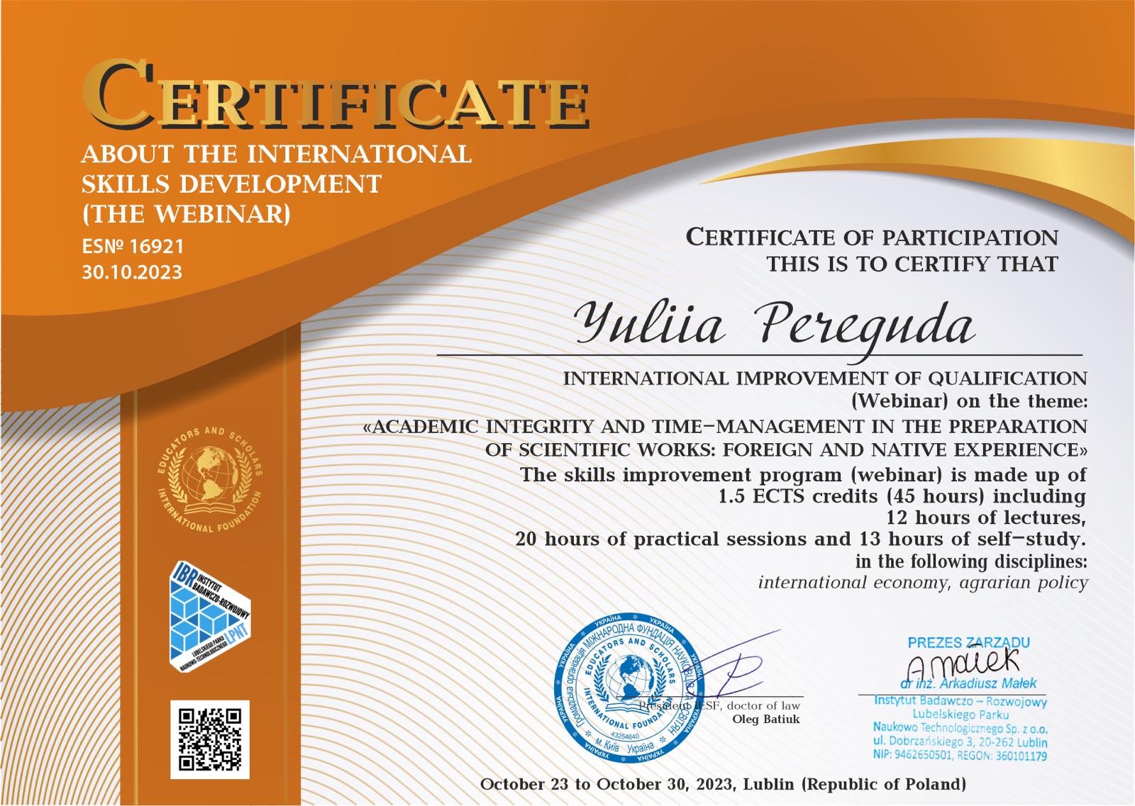 В рамках підвищення кваліфікації Перегуда Ю.А. ознайомилась з проблематикою в рамках тематики наука і тайм-менеджмент, ефективні техніки управління часом. Також була окрема тема, щодо світових стандартів академічного письма: від теорії до практики (з урахуванням вимог провідних світових видавництв та університетів), які є цінними для подальшого впровадження та використання матеріалів в рамках наукових дисциплін зі студентами спеціальності «Туризм і рекреація», а напрямок академічної доброчесності та навички якісного академічного письма як важливі компетентності здобувачів вищої освіти, особливо вважливими при формуванні тайм-менеджменту при написанні кваліфікаційної роботи.