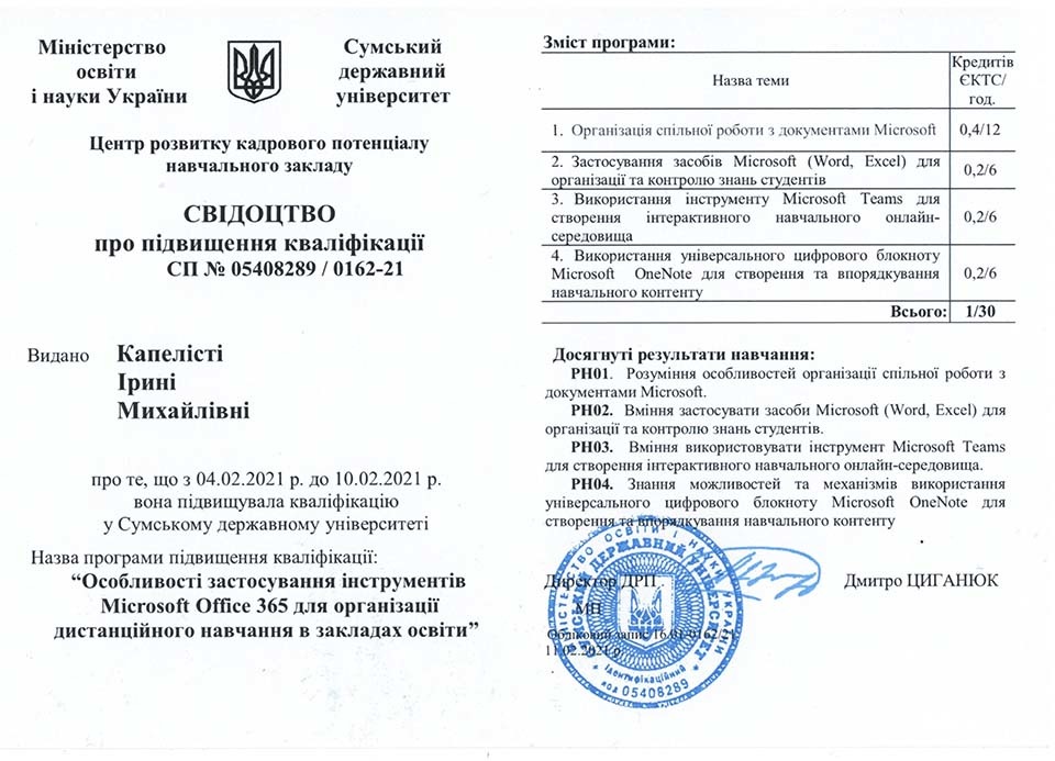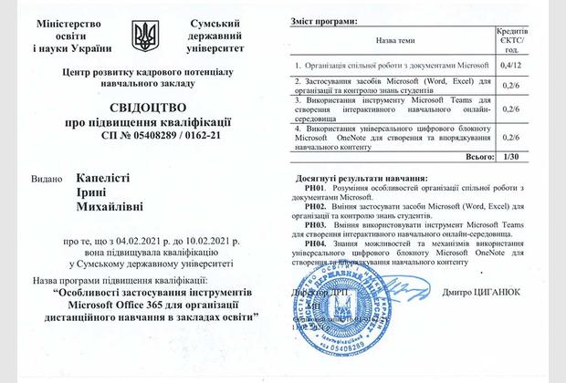 пройшла навчання за програмою підвищення кваліфікації «Особливості застосування інструментів Microsoft Office 365 для організації дистанційного навчання в закладах освіти». За результатами підвищення кваліфікації Центром організації наукової роботи МАУП було створено бібліотеку навчальних відео для викладачів МАУП з метою підвищення рівня їх викладацької майстерності в умовах змішаного та дистанційного навчання. Доступ до бібліотеки можна отримати за запитом на електронну адресу Центру - [email protected]. У листі потрібно зазначити Ваше ПІБ, посаду у МАУП та бажання отримати доступ до навчальних відео за темою дистанційної освіти.