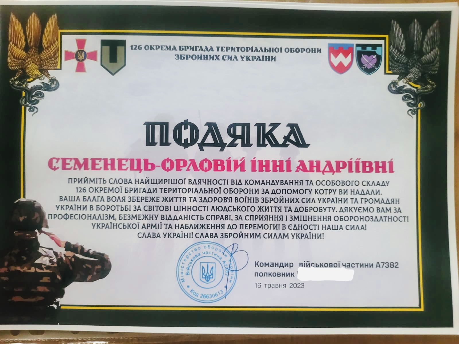 Директор Навчально-наукового інституту управління, економіки та бізнесу Семенець-Орлова Інна Андріївна відзначена подякою 126 окремої бригади територіальної оборони Збройних Сил України - за сприяння і зміцнення обороноздатності Української Армії та наближення до Перемоги.
