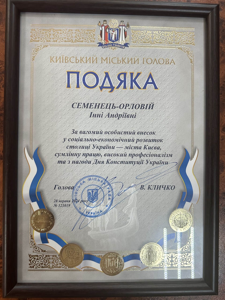 Семенець-Орлову Інну Андріївну та Кузьменко Ганну Олександрівну - завідувача та заступника завідувача кафедри публічного адміністрування ННІУЕБ МАУП відзначено за сумлінну працю, високий професіоналізм та вагомий особистий внесок у соціально-економічний розвиток столиці України - м. Києва Подяками Київського міського голови В.Кличка з нагоди Дня Конституції 28 червня.
