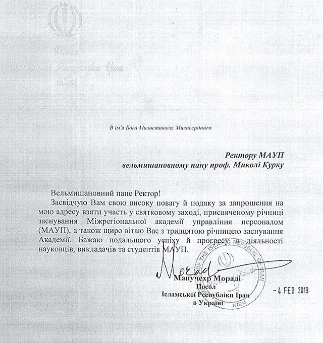 Надзвичайний і Повноважний Посол Ісламської Республіки Іран в Україні та Республіці Молдова (за сумісництвом) Пан Манучехр Мораді