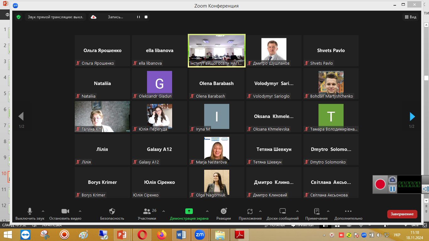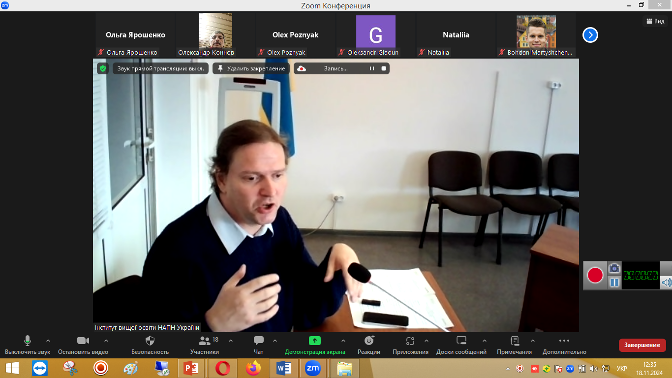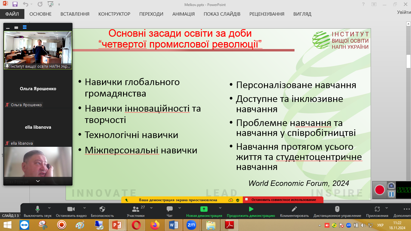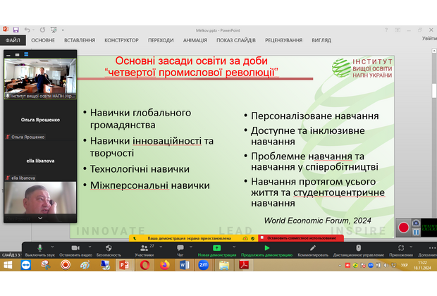 Професор кафедри філософії та суспільних дисциплін, доктор філософських наук Мєлков Юрій Олександрович та доцент, кандидат філософських наук Нич Тамара Володимирівна взяли участь у засіданні «круглого столу» на тему «Повоєнне відновлення вищої освіти: зарубіжний досвід і світоглядно-методологічні засади», який відбувся 18 листопада 2024 року. Захід був організований Інститутом вищої освіти НАПН України разом із Інститутом демографії та проблем якості життя НАН України.