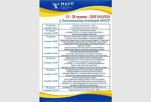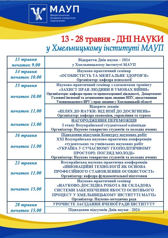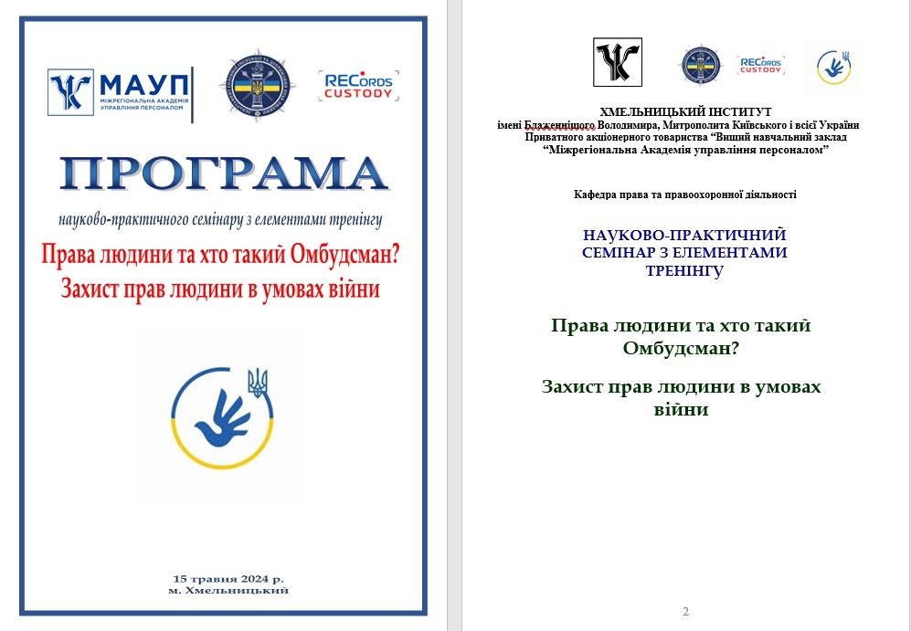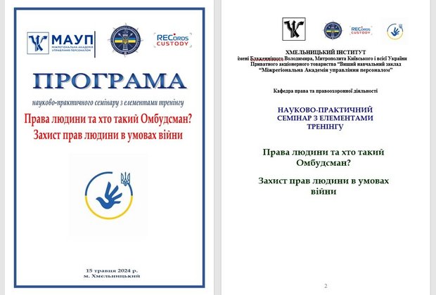 В запланованих заходів до «Днів науки Хмельницькому інституті МАУП – 2024» в межах просвітницької діяльності для студентів Інституту 15 травня 2024 р. проведено навчально-практичний семінар з елементами тренінгу «Права людини та хто такий Омбудсман? Захист прав людини в умовах війни».