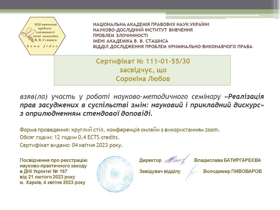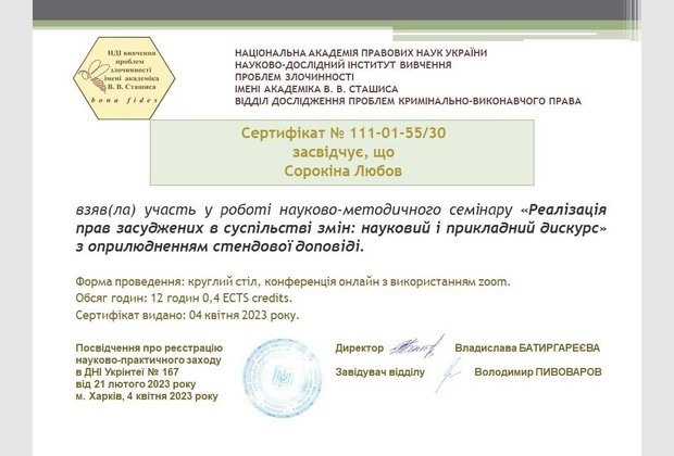 Завідувач кафедри правоохоронної та антикорупційної діяльності ННІП Заросило Волидимир Олексійович та заступник завідувача кафедри Сорокіна Любов взяли участь у Всеукраїнському науково-методичному семінарі у формі круглого столу (онлайн ) на тему "Реалізація прав засуджених в суспільстві змін: науковий і прикладний дискус" організованого Науково-дослідним інститутутом вивчення проблем злочинності імені академіка В.В. Сташиса Національної академії правових наук України.