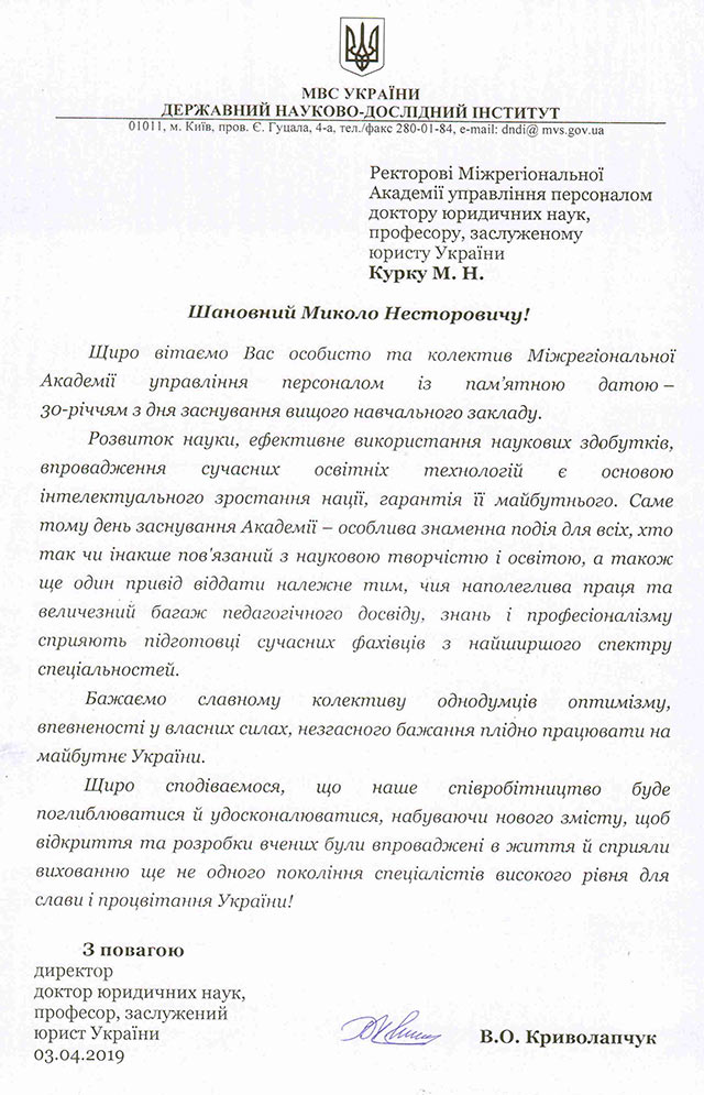 Привітання від Державного науково-дослідного інституту МВС України