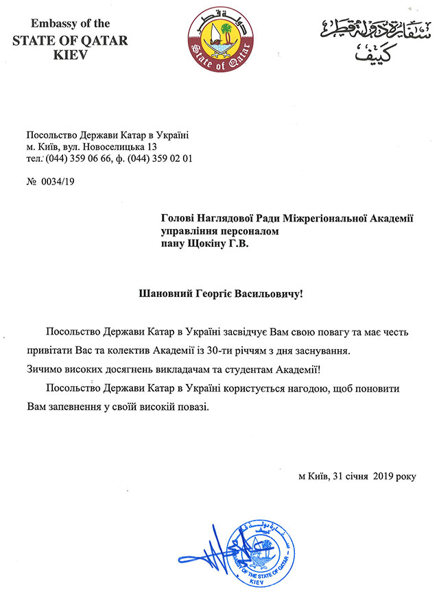 Привітання від посла держави Катар