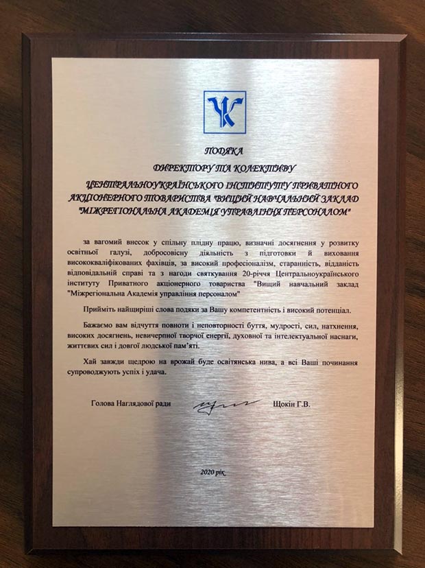 - Привітання з нагоди 20-річчя Центальноукраїнського інституту ПрАТ «Вищий навчальний заклад «Міжрегіональна Академія управління персоналом»