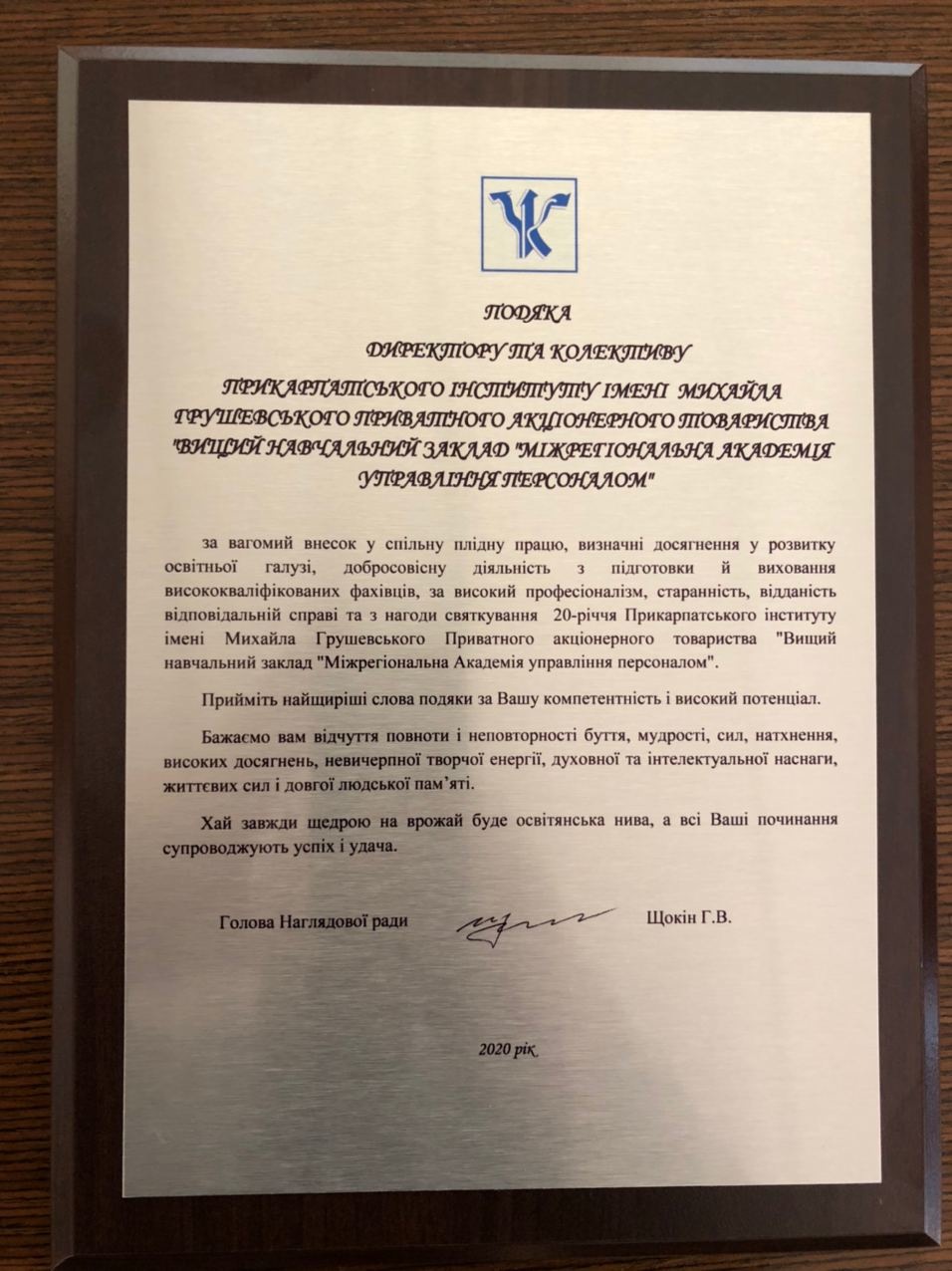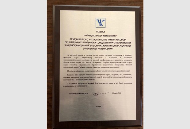 - Привітання з нагоди 20-річчя Прикарпатського інституту ім. Михайла Грушевського ПрАТ "ВНЗ "Міжрегіональна Академія управління персоналом"