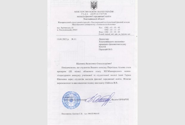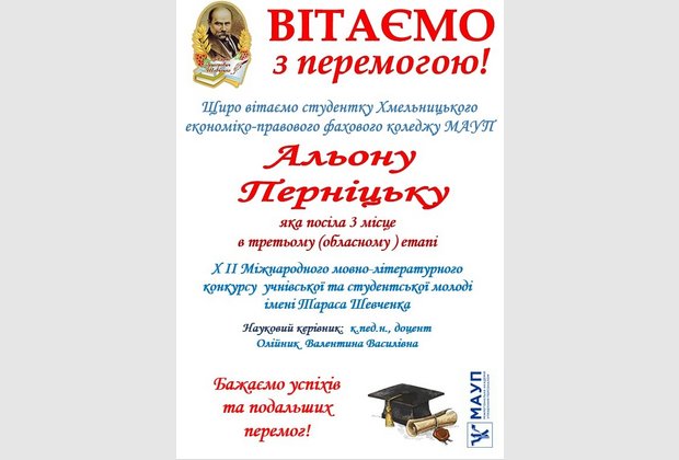 Вітаємо студентку Хмельницького економіко-правового фахового коледжу МАУП Перніцьку Альону, яка посіла 3 місце в третьому (обласному ) етапі ХІІ Міжнародного мовно-літературного конкурсу учнівської та студентської молоді імені Тараса Шевченка.