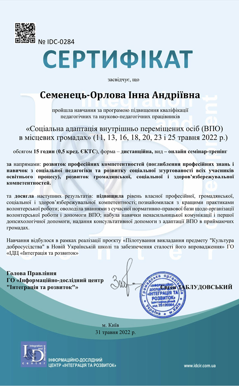 «Соціальна адаптація внутрішньо переміщених осіб (ВПО) в місцевих громадах» за напрямом розвитку професійних компетентностей (поглиблення професійних знань і навичок з соціальної педагогіки та розвитку соціальної згуртованості всіх учасників освітнього процесу), оволоділа знаннями з сучасної нормативно-правової бази щодо організації волонтерської роботи і допомоги ВПО, набула навички ненасильницької комунікації і першої допсихологічної допомоги, надання консультативної допомоги з адаптації ВПО в приймаючих громадах.