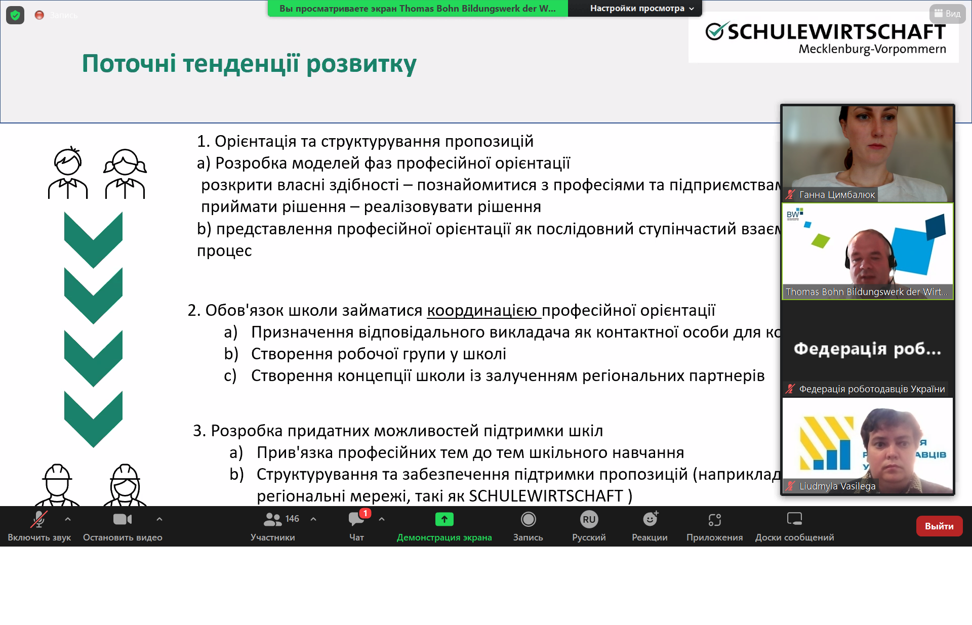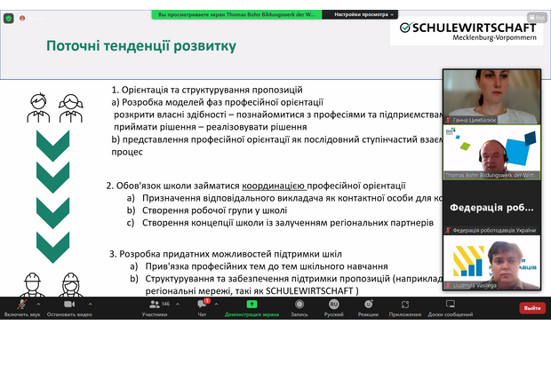 З вітальними словами перед початком заходу до численних слухачів звернулися: директорка Центру компетенцій та розвитку людського капіталу Федерації роботодавців України Людмила Василега та керівник освітнього центру економіки землі Мекленбург-Передня Померанія Генрі Уширман. Спікером вебінару виступив Томас Бонн, (Німеччина), співробітник Освітнього центру, керівник проєкту професійної орієнтації SCHULEWIRTSCHAFT.