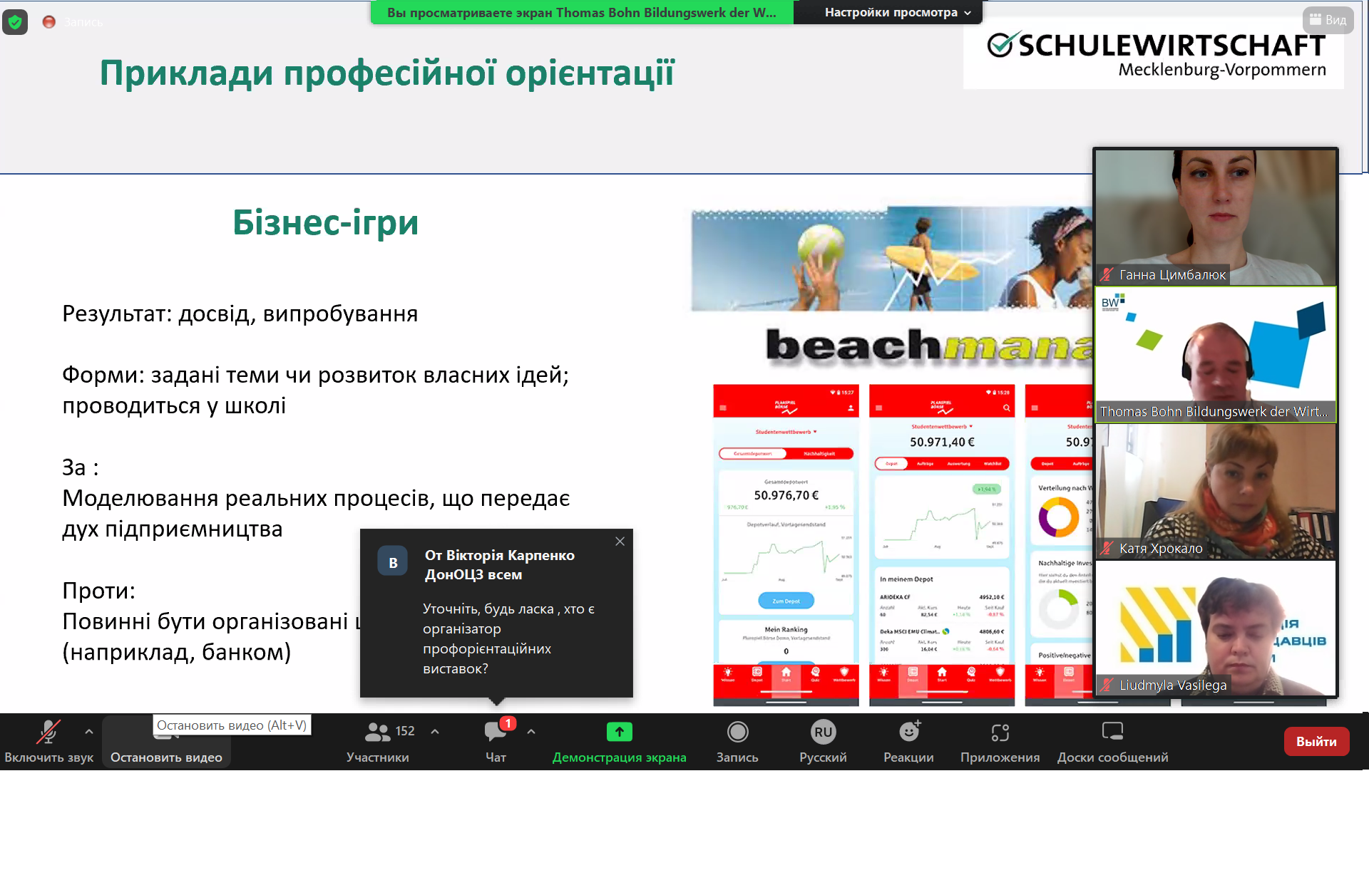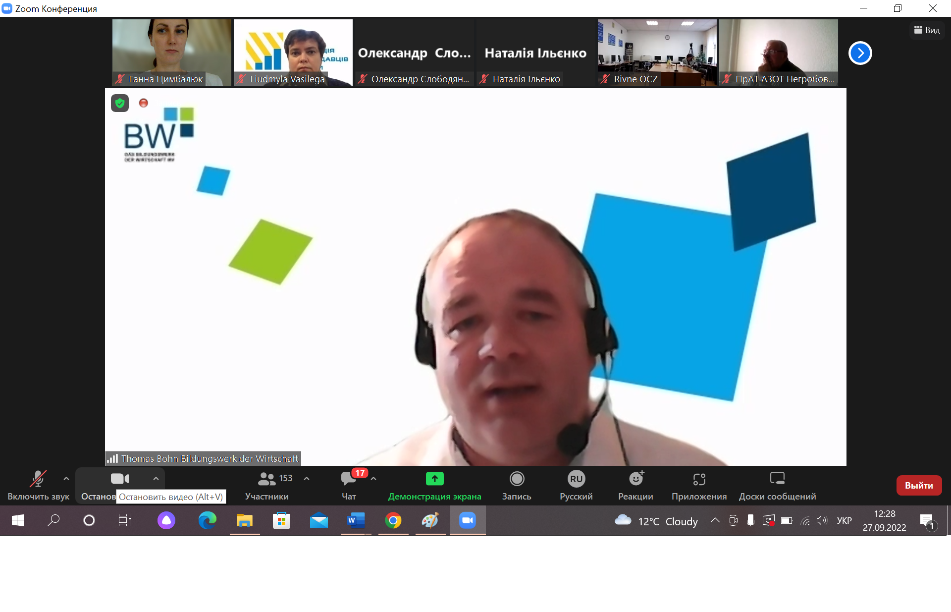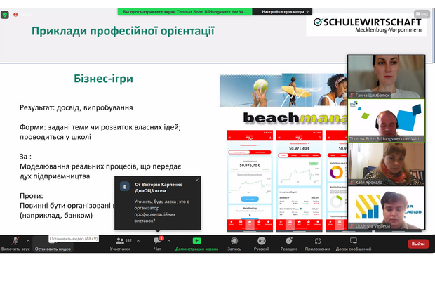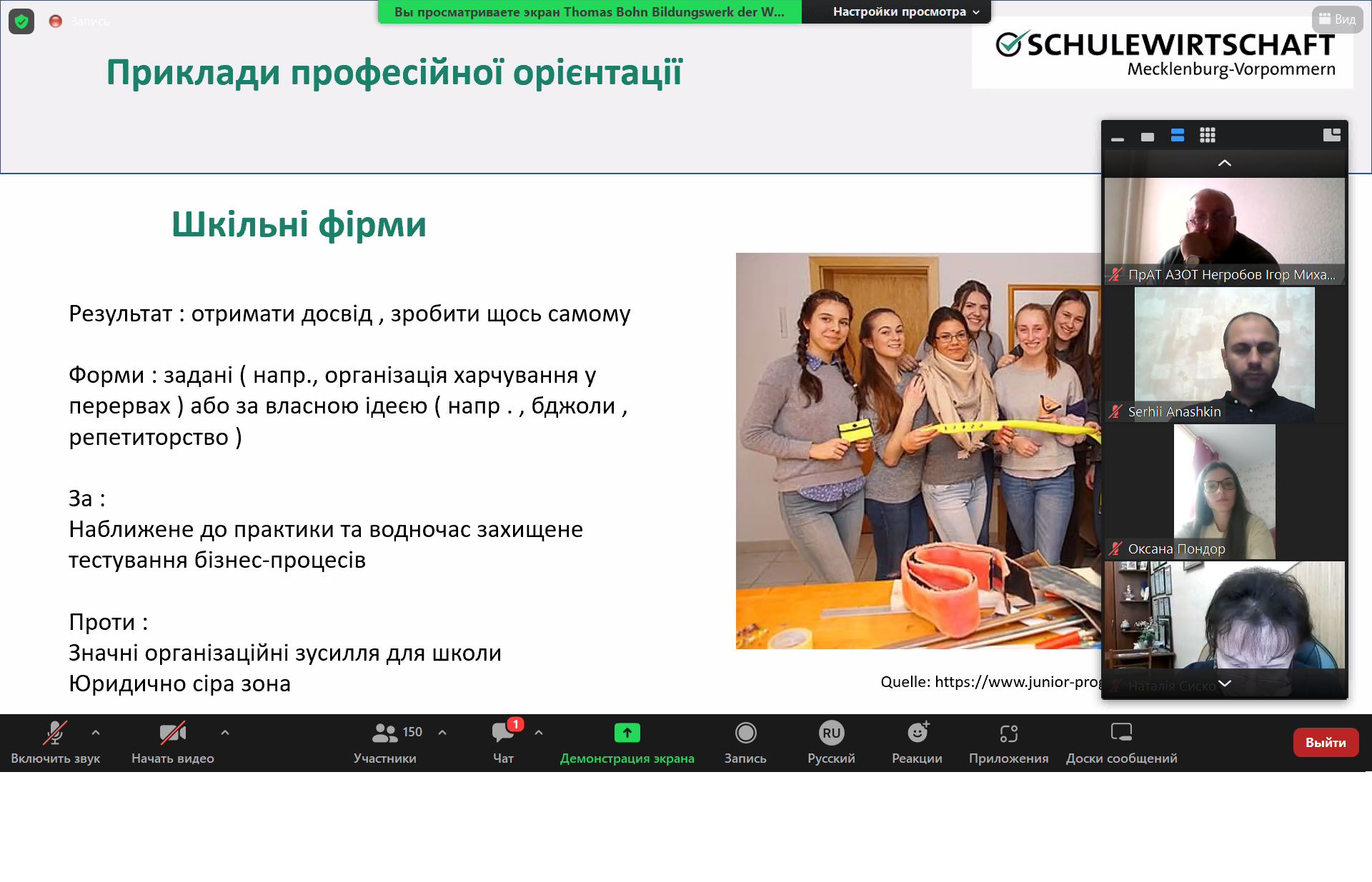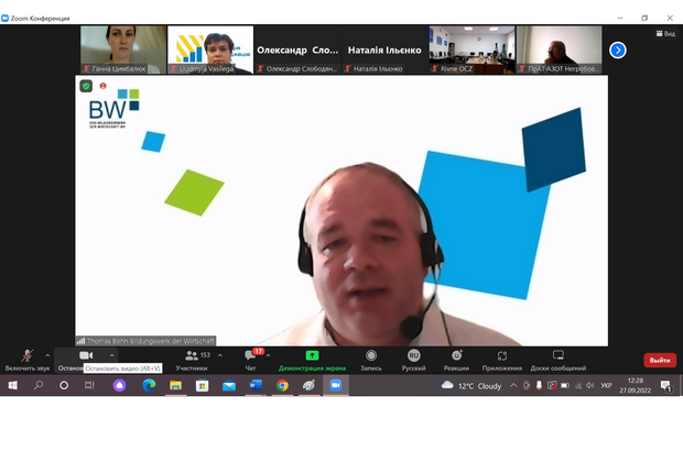 Під час вебінару були розглянуті питання організації та проведення професійної орієнтації в Німеччині та взаємодія бізнесу та закладів освіти, приклади партнерства. По завершенню презентації Томас Бонн відповів на численні питання слухачів.