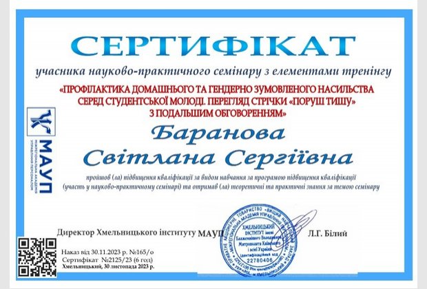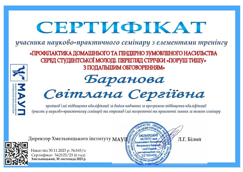 30 листопада 2023 року для студентів спеціальності 053 «Психологія» денної форми навчання проведено науково-практичний семінар з елементами тренінгу «Профілактика домашнього та гендерно зумовленого насильства серед студентської молоді. Перегляд стрічки «Поруш тишу» з подальшим обговоренням».