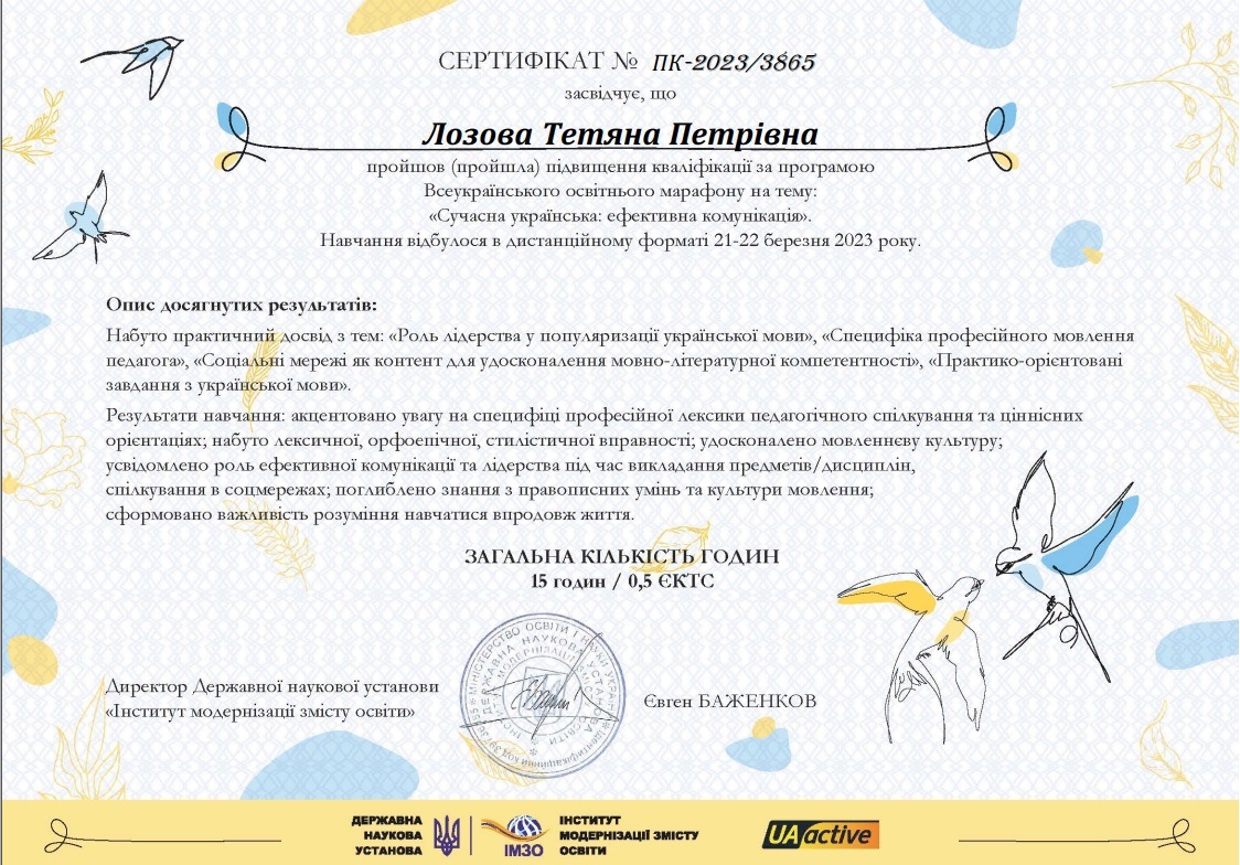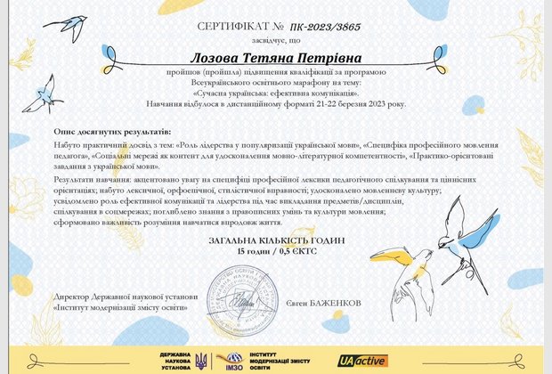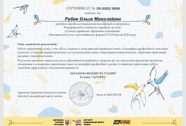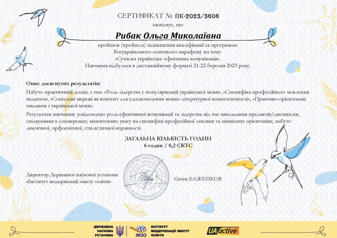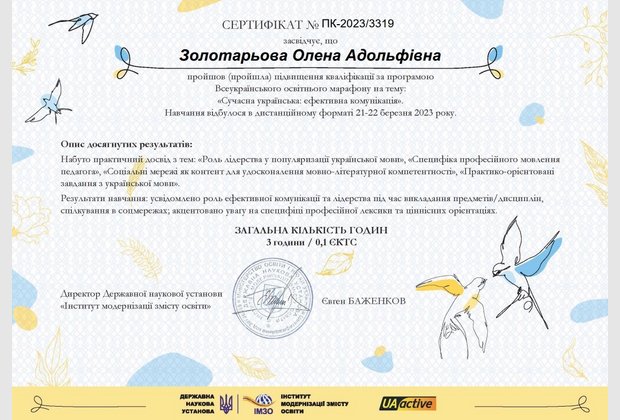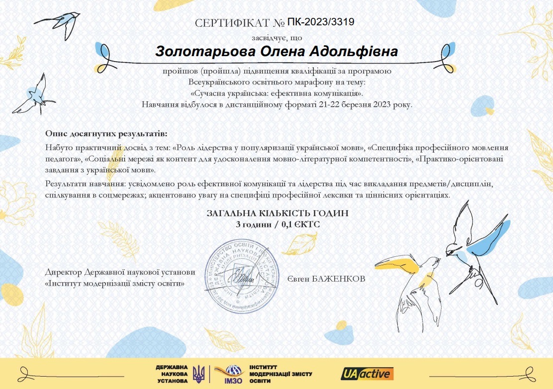 Викладачі Одеського інституту МАУП 21-22 березня 2023 року пройшли підвищення кваліфікації за програмою Всеукраїнського освітнього марафону «Сучасна українська: ефективна комунікація», набули практичний досвід з тем: «Роль лідерства у популяризації української мови», «Специфіка професійного мовлення педагога», «Соціальні мережі як контент для удосконалення мовно-літературної компетентності», «Практико-орієнтовані завдання з української мови» та отримали сертифікати.