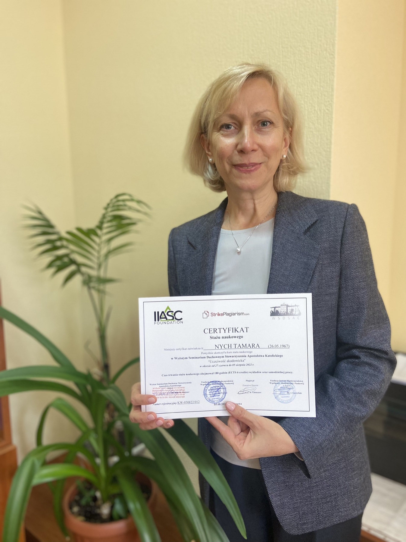 Завідувач кафедри філософії та суспільних дисциплін Нич Т.В. отримала диплом про проходження міжнародного стажування за програмою “Академічна доброчесність”. Стажування, організоване польсько-українською фундацією “Інститут Міжнародної Академічної і Наукової Співпраці” (IIASC), відбувалось протягом 6 тижнів (з 27 червня по 05 серпня 2022 року) on-line на базі Вищого Семінаріуму Духовного університету UKSW, Варшава.