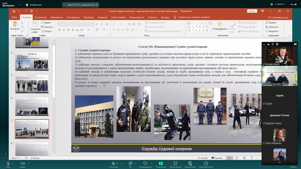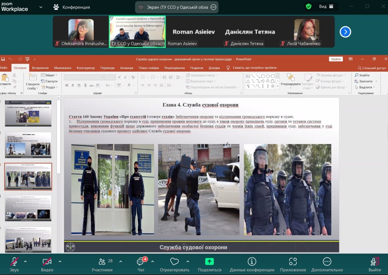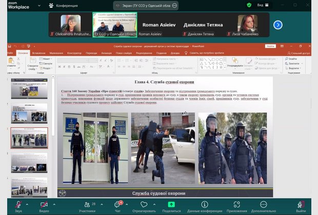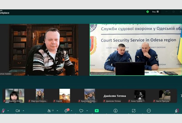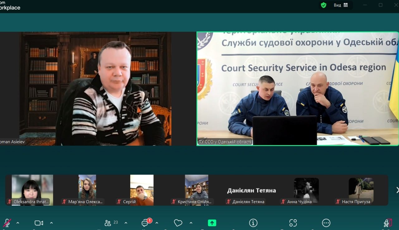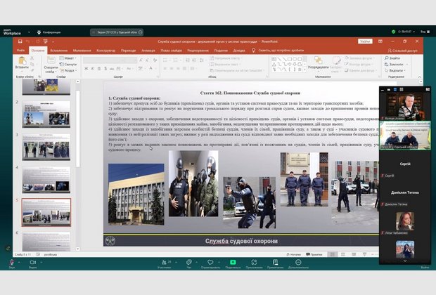 Під час проведення заняття лектори зазначили, що перші ознаки судової охорони з’явилися з Козацьких часів. Загалом судді не потребували охорони, оскільки особисто нічого не вирішували, а вносили пропозиції на розгляд усього товариства, яке й ухвалювало остаточне рішення. Проте генеральна старшина – генеральний суддя – мав своєрідну охорону – джурів. Згодом Дем’ян Многогрішний створив гетьманську гвардію, специфічну охоронну службу, невеликий військовий загін. Уже в незалежній Україні у 2003 році, було створено Спеціальний підрозділ судової міліції «Грифон». Його завданнями були, зокрема, такі: гарантувати безпеку працівників суду, осіб, які беруть участь у кримінальному судочинстві, членів їхніх родин, охороняти судові установи, приміщення й території установ судових експертиз, підтримувати порядок у суді тощо. У 2019 році було створено Службу судової охорони.