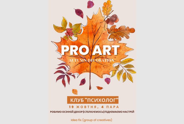 19 жовтня 2022 року студентським психологічним клубом «Психолог», в рамках плану роботи Клубу була проведена творча зустріч студентів PRO-ART, присвячена осінній тематиці.