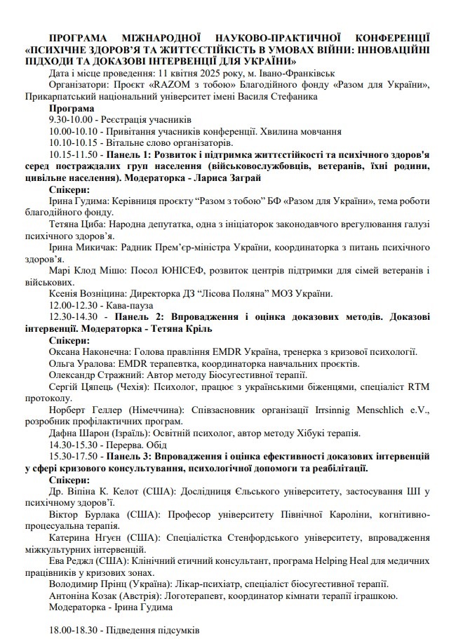 11 квітня 2025 року студенти-психологи бакалаврату 3-4 курсів і магістратури та викладачі кафедри психології Хмельницького інституту МАУП взяли онлайн-участь у Міжнародній науково-практичній конференції «Психічне здоров’я та життєстійкість в умовах війни: інноваційні підходи та доказові інтервенції для України». Організаторами виступили: проєкт «RAZOM з тобою» Благодійного фонду «Разом для України», Прикарпатський національний університет імені Василя Стефаника.