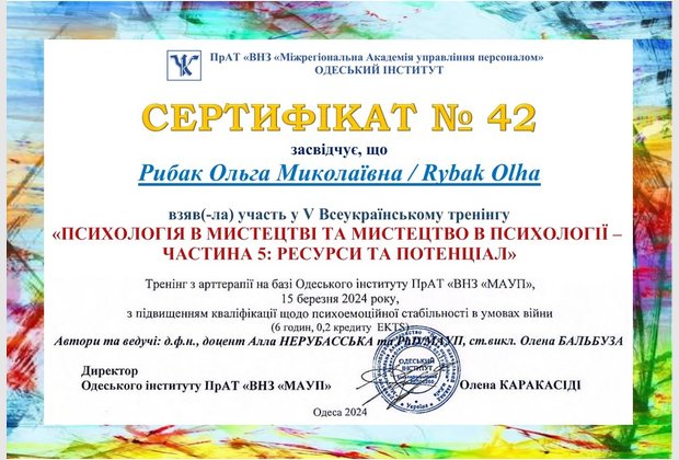 15 березня 2024 р. в Одеському інституті МАУП відбувся Всеукраїнський захід – лекція-тренінг на тему: «Психологія в мистецтві та мистецтво в психології – частина 5: ресурси та потенціал»