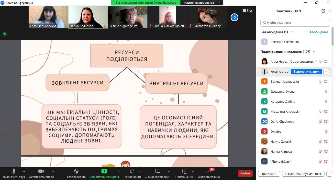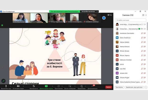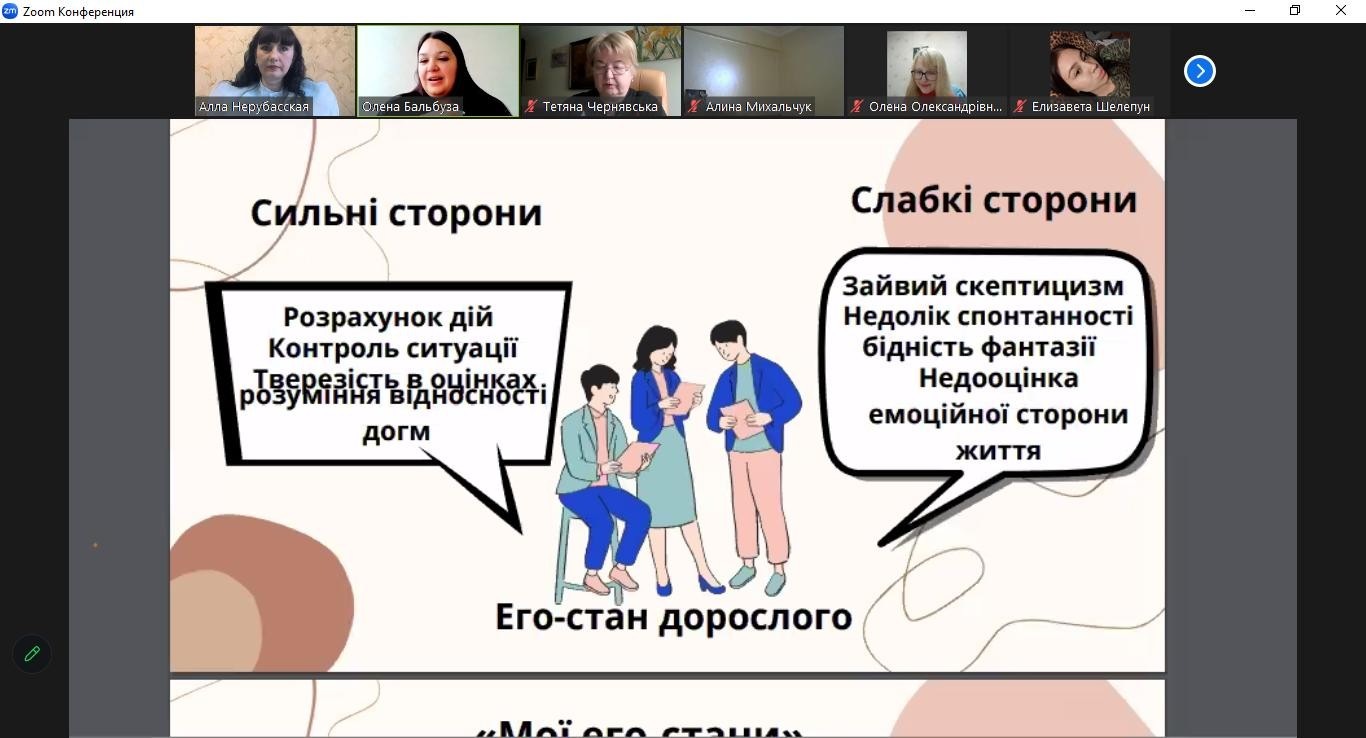 В першій частині тренінгу Олена Бальбуза звернула увагу на відмінність понять «ресурс» та «потенціал», розповіла про зовнішні та внутрішні ресурси, три стани особистості за Е. Берном та перейшла до практичної частини, де презентувала свою авторську колоду асоціативних метафоричних карт «Мої Его-стани». З учасниками апробовано декілька алгоритмів, метою яких було показати слабкі та сильні сторони особистості, використано сучасні технічні можливості при роботі с МАК-колодою.