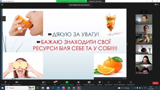 З учасниками проведено дві вправи для зняття стресу та емоційної напруги «Лимон» та «Апельсин», а також на картинах відомих художників учасники тренінгу інтерпретували символічний зміст цих фруктів.
