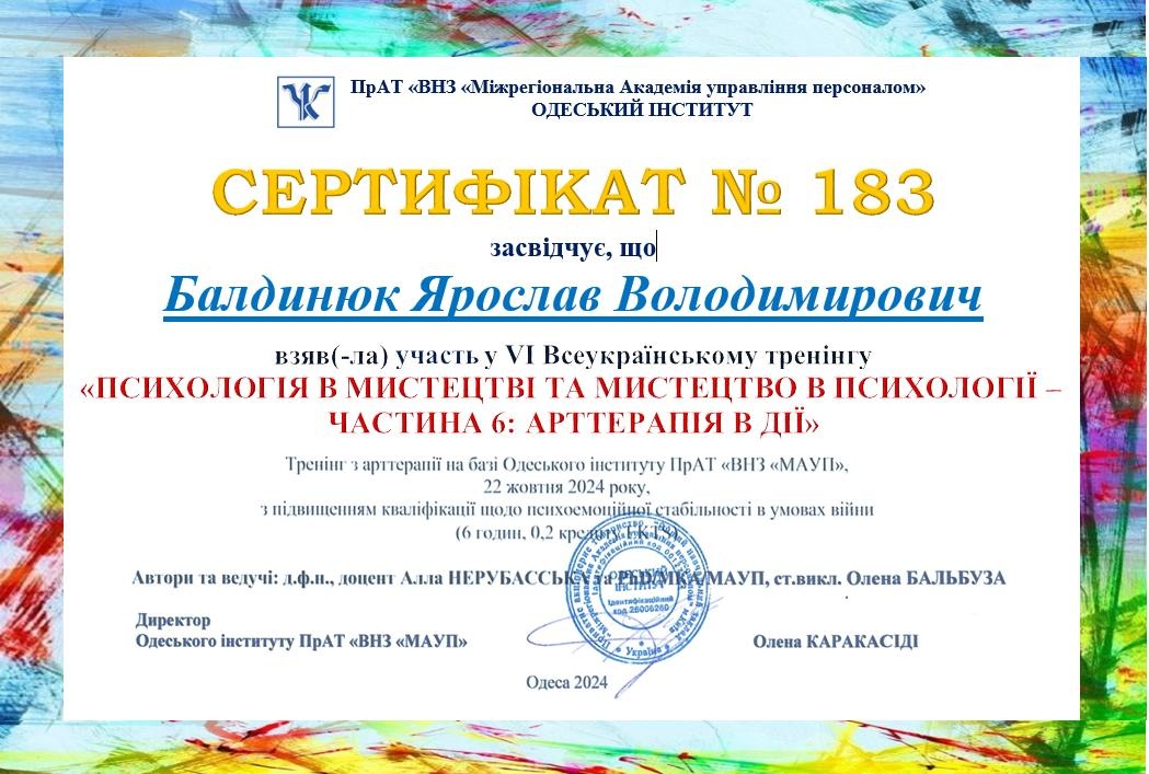 22 жовтня 2024 року на базі Одеського інституту МАУП, в рамках програми підвищення кваліфікації науково-педагогічного складу та підтримки викладачів і студентів під час війни, вже вшосте був проведений Всеукраїнський захід: лекція-тренінг, на тему «Психологія в мистецтві та мистецтво в психології – частина 6: арттерапія в дії».