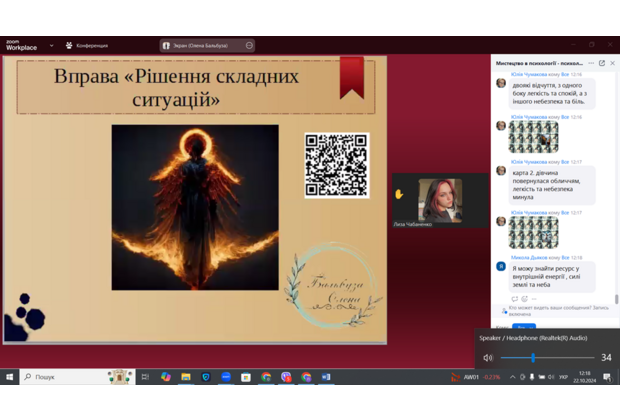 За допомогою авторських колод показано, як працюють психологи з запитами клієнтів, проведені демоверсії психологічних сесій з МАК, кожним учасником створено особистого метелика - символу народження, життя та трансформації; в онлайн режимі ознайомились з нейрографічним малюнком.