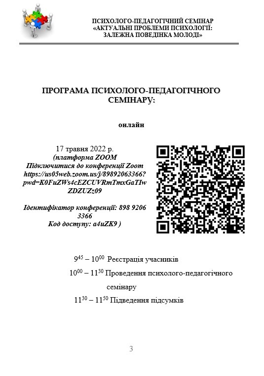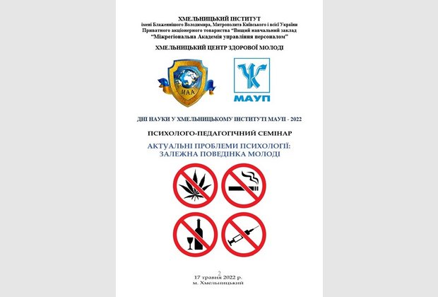 17 травня 2022 року в рамках Днів науки - 2022 в режимі онлайн відбувся психолого-педагогічний семінар «Актуальні проблеми психології: залежна поведінка молоді».