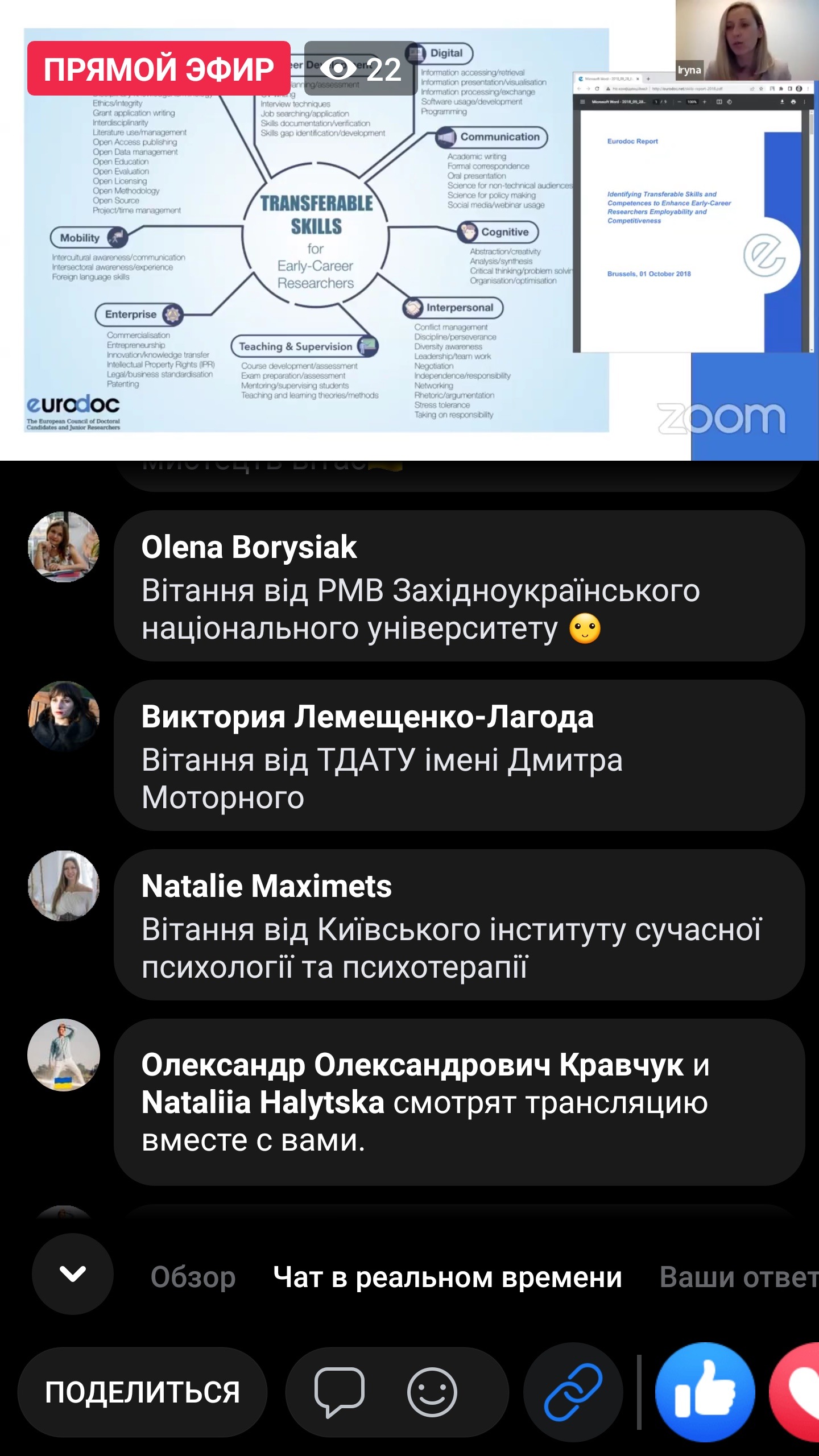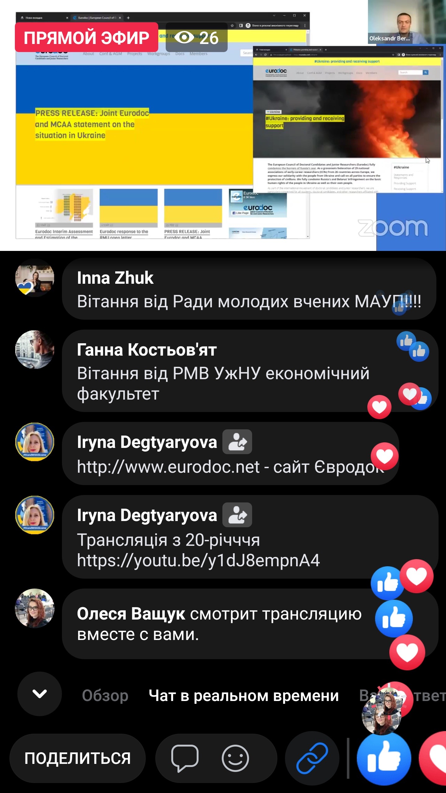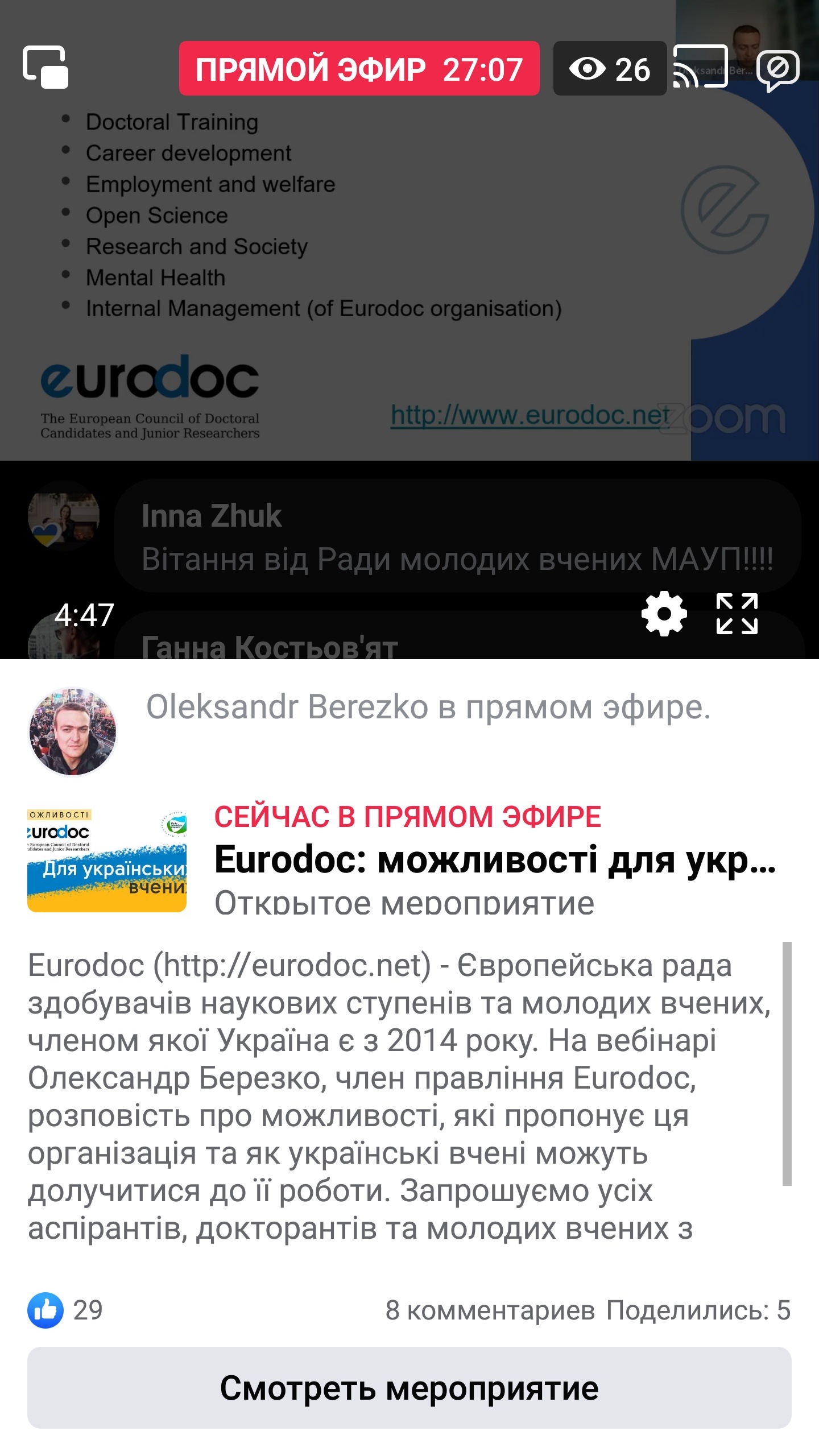 На вебінарі Oleksandr Berezko, член правління Eurodoc, розповів про можливості, які пропонує ця організація та як українські вчені можуть долучитися до її роботи.