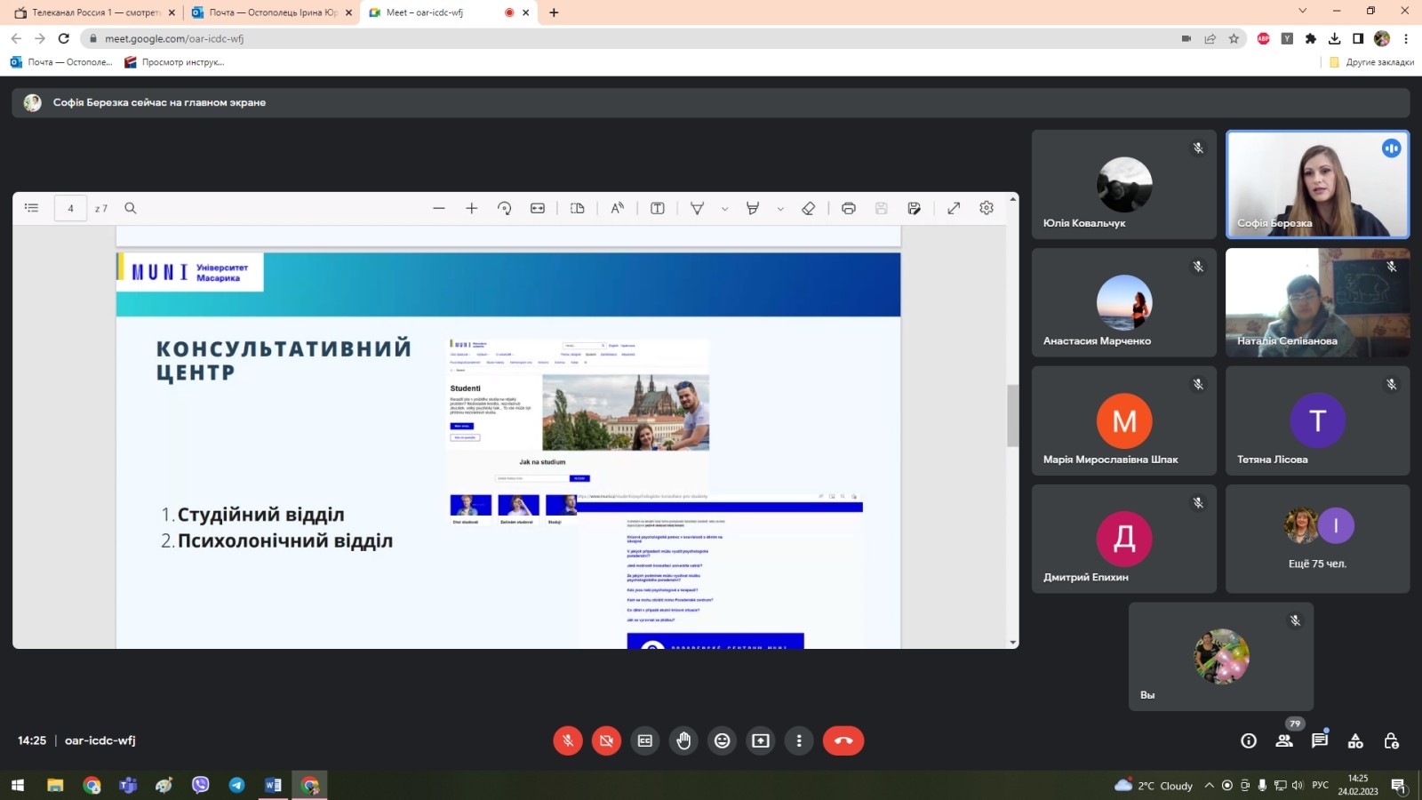 Викладачі і студенти спеціальності Психологія Одеського інституту МАУП 24 лютого 2023 року взяли участь в онлайн зустрічі з психологом університету Масарика (м.Брно, Чехія) Софією Березкою в рамках проєкту "Скарбничка фахівця-психолога"