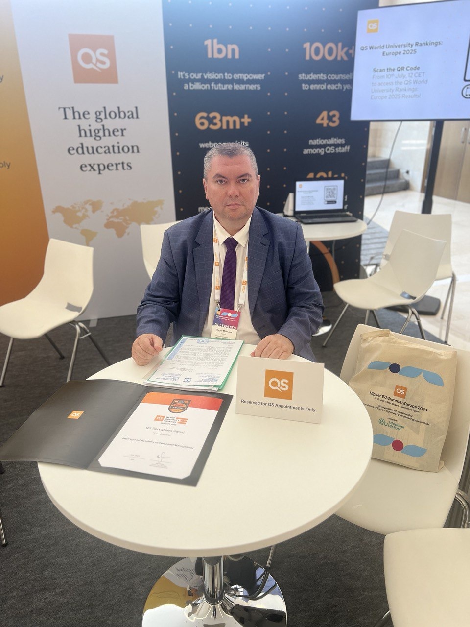 Ректор Міжрегіональної Академії управління персоналом Кирило Володимирович Муравйов у рамках роботи QS Саміту з вищої освіти: Європа 2024, який проходить у місті Барселона, отримав від імені Академії нагороду У категорії «Нові учасники» відзначаються заклади, які входять до рейтингу QS World University Rankings: Europe rankings вперше цього року.