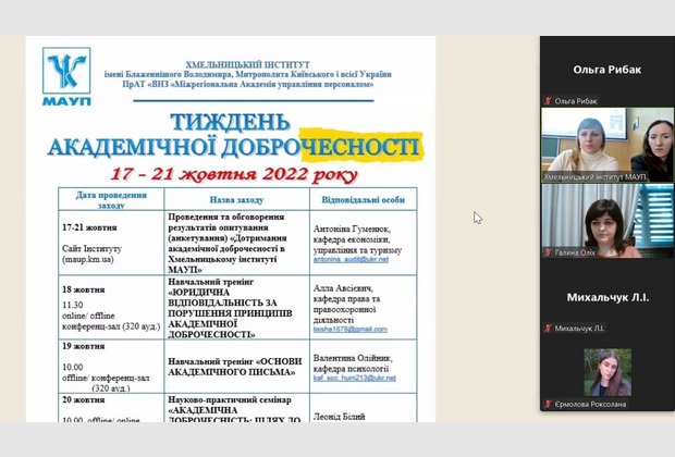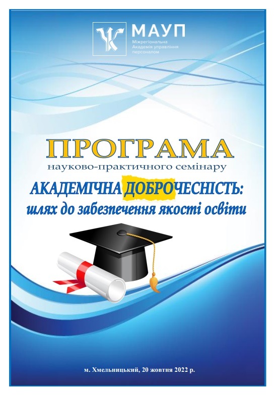 20 жовтня 2022 року викладачі і студенти Одеського інституту МАУП взяли участь в організованому Хмельницьким інститутом МАУП науково-методичному семінарі з академічної доброчесності “АКАДЕМІЧНА ДОБРОЧЕСНІСТЬ: ШЛЯХ ДО ЗАБЕЗПЕЧЕННЯ ЯКОСТІ ОСВІТИ”.