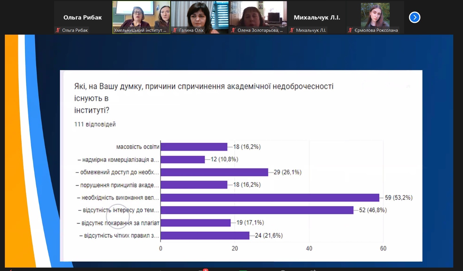 Учасники відмітили цікавий досвід хмельницьких колег в проведенні Тижнів академічної доброчесності, опитувань з питань дотримання академічної доброчесності та інших проблем її забезпечення в академічній спільноті.