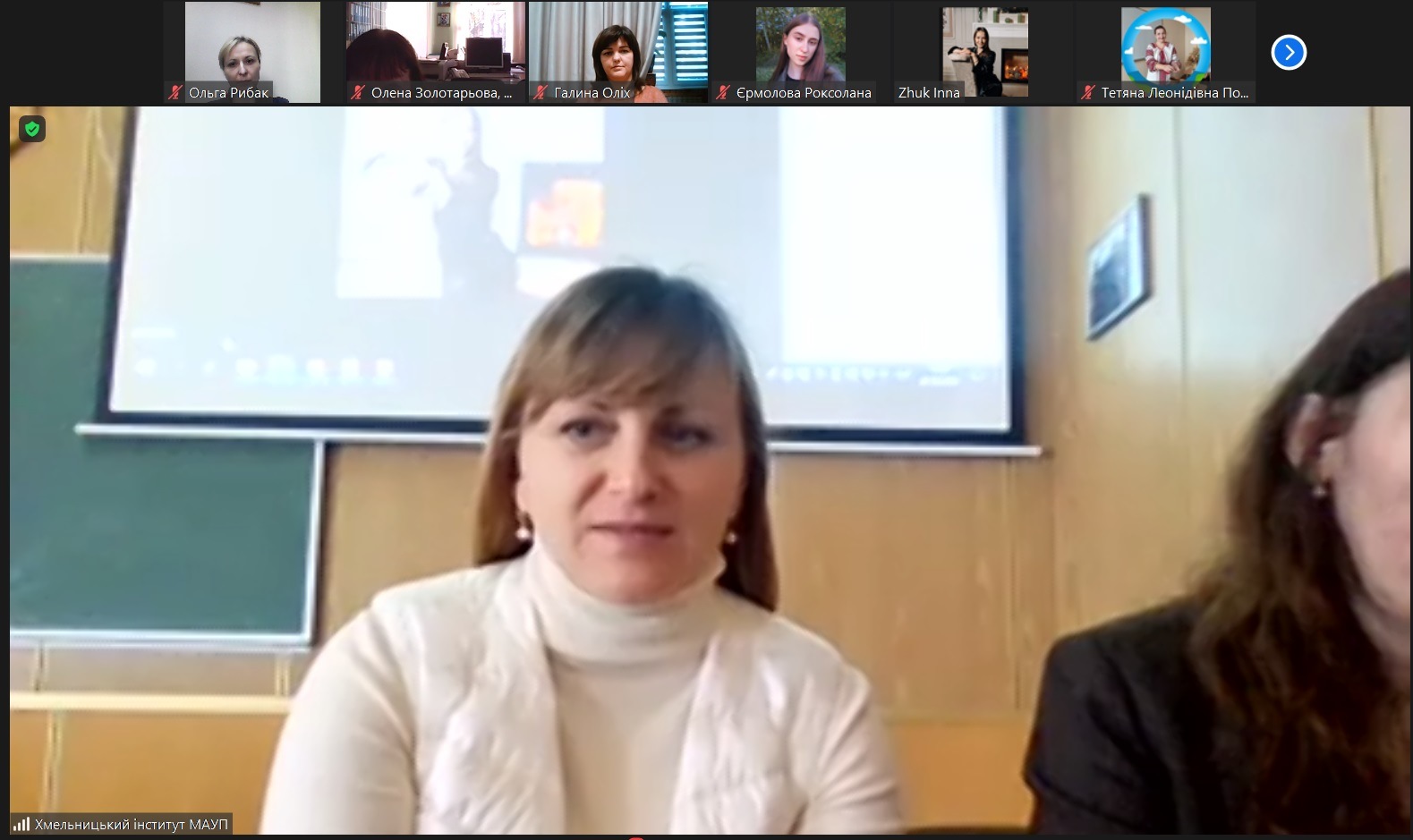 Наша колега, доцент кафедри правових дисциплін Олена Золотарьова розповіла учасникам про практику здійснення групового проєкту "Кодекс честі нашої групи" з прийняття окремих Кодексів честі групами 1 або 2 курсу кожної спеціальності при завершенні вивчення дисциплін "Академічні студії" чи "Основи академічного письма", про дію Етичного кодексу Інституту.