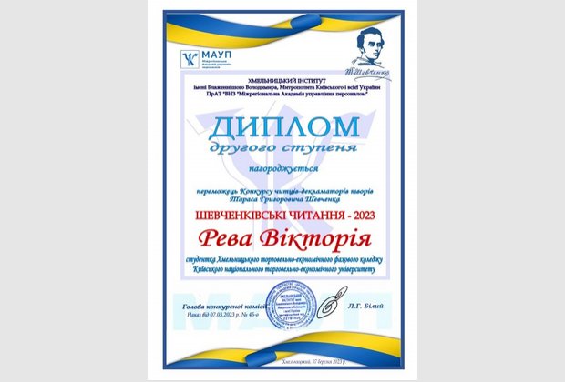 2 місце – Рева Вікторія (студентка Відокремленого структурного підрозділу «Хмельницький торговельно-економічний фаховий коледж Київського національного торговельно-економічного університету»)