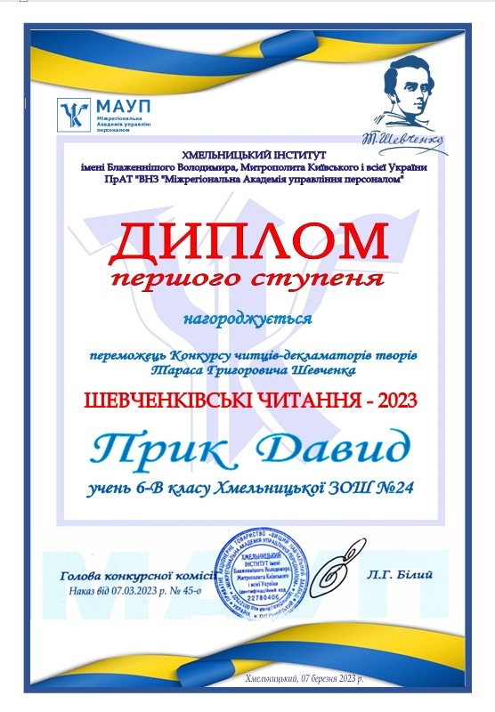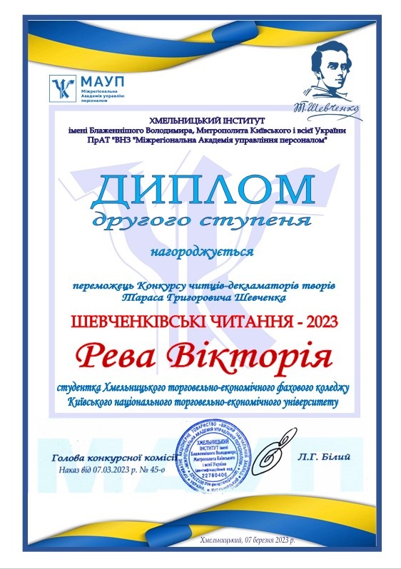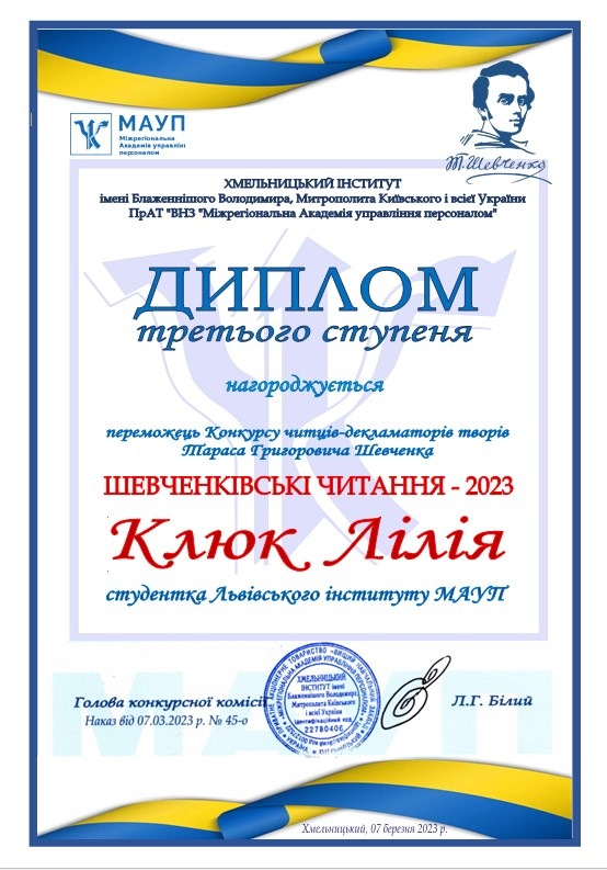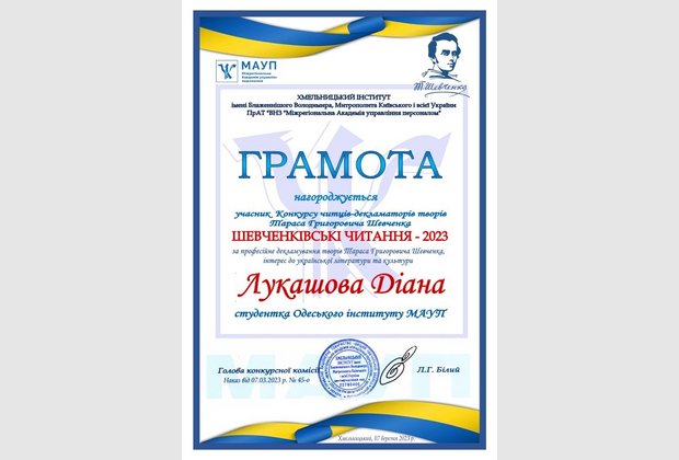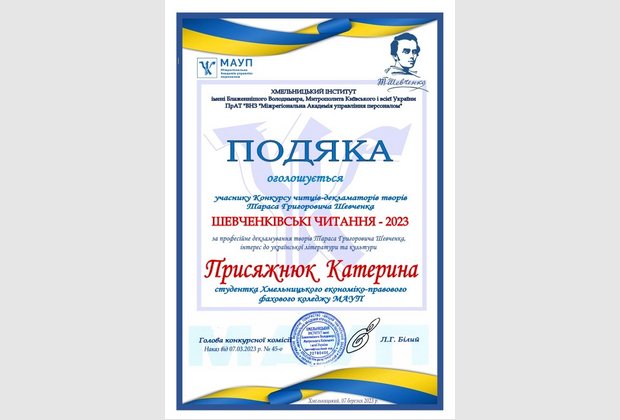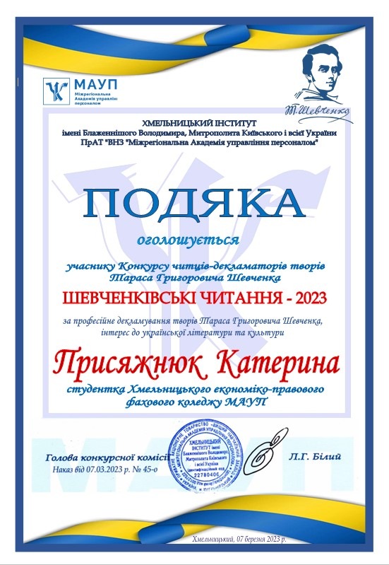 7 березня 2023 року у Хмельницькому інституті МАУП відбувся Конкурс читців-декламаторів творів Тараса Григоровича Шевченка.