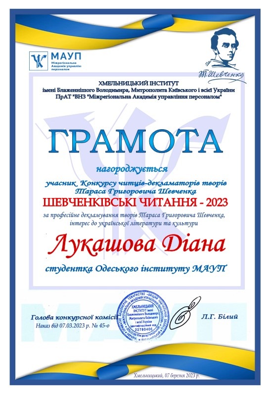 – Лукашову Діану (студентка 3 курсу Одеського інституту ПрАТ «ВНЗ «Міжрегіональна Академія управління персоналом»)