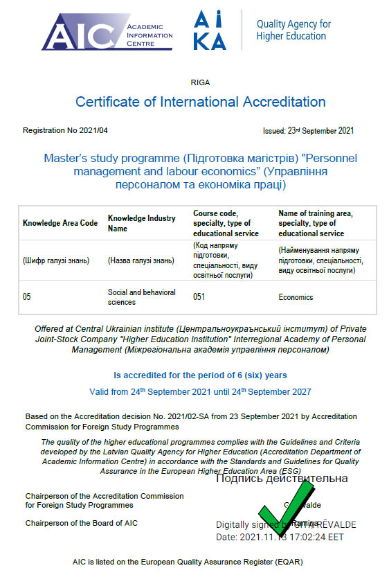 - Магістерська освітня програма “Управління персоналом та економіка праці” за спеціальністю 051 Економіка, яка запроваджується в Центральноукраїнському інституті ПрАТ “ВНЗ “Міжрегіональна Академія управління персоналом” (Сертифікат про міжнародну акредитацію, Реєстраційний номер 2021/04; дата: 23 вересня 2021 року; термін дії з 24 вересня 2021 року до 24 вересня 2027 року);
