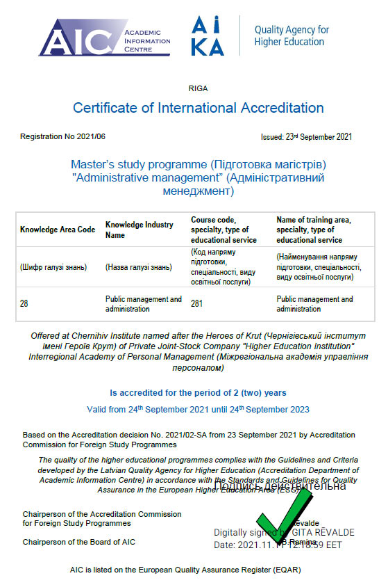 - Магістерська освітня програма “Адміністративний менеджмент” за спеціальністю 281 Публічне управління та адміністрування, яка запроваджується в Чернігівському інституті ПрАТ “ВНЗ “Міжрегіональна Академія управління персоналом” (Сертифікат про міжнародну акредитацію, Реєстраційний номер 2021/06 ; дата: 23 вересня 2021 року; термін дії з 24 вересня 2021 року до 24 вересня 2023 року);