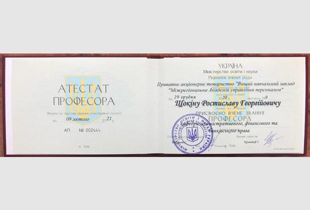 Рішенням Міністерства освіти і науки України та Вченої ради Приватного акціонерного товариства «Вищий навчальний заклад «Міжрегіональна Академія управління персоналом» доктору юридичних наук, доценту Щокіну Ростиславу Георгійовичу присвоєно вчене звання «Професор» кафедри адміністративного, фінансового та банківського права.