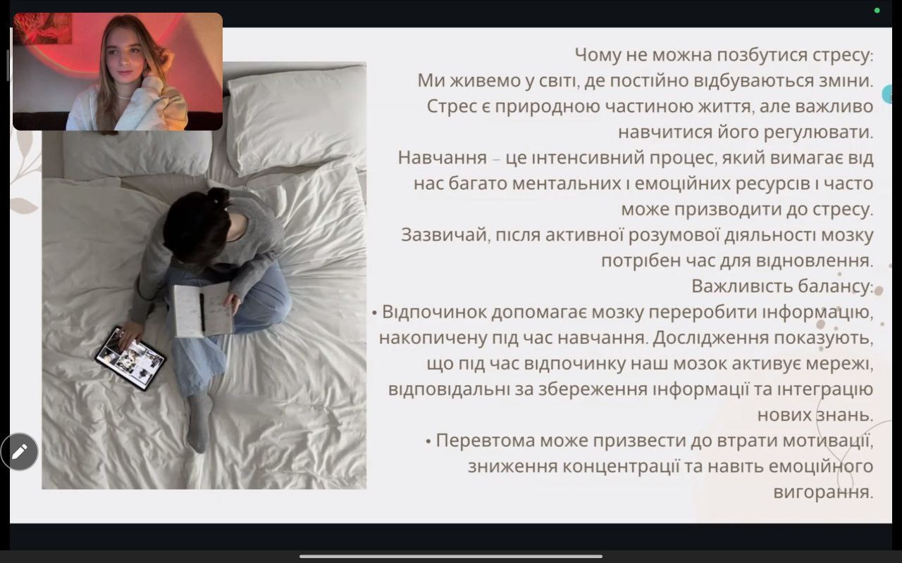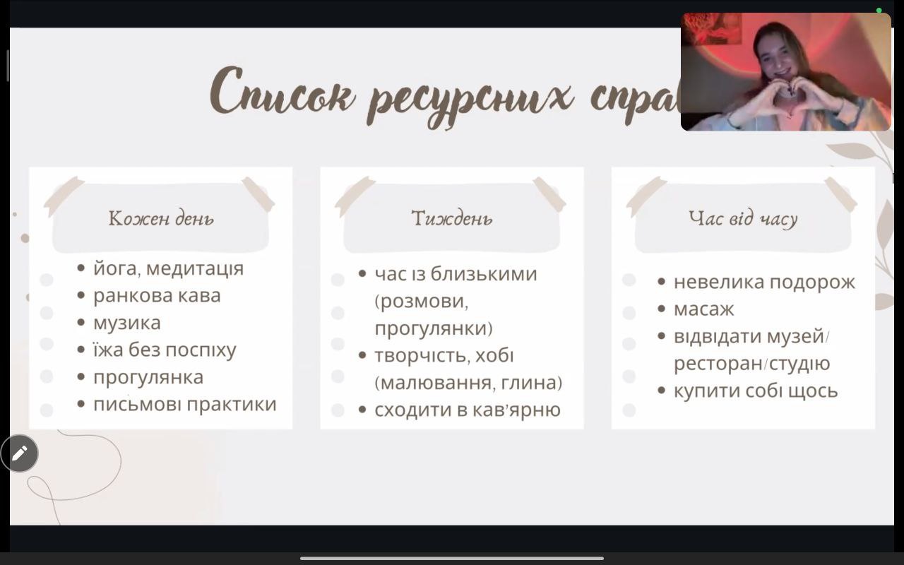 Спікером на заході виступила студентка 4 курсу спеціальності Психологія Вікторія Терзі, яка розповіла про те, що таке ресурсний стан людини та від чого він залежить. Вікторія надала корисні поради та рекомендації для збереження ресурсного стану людини та провела дискусію зі всіма слухачами.