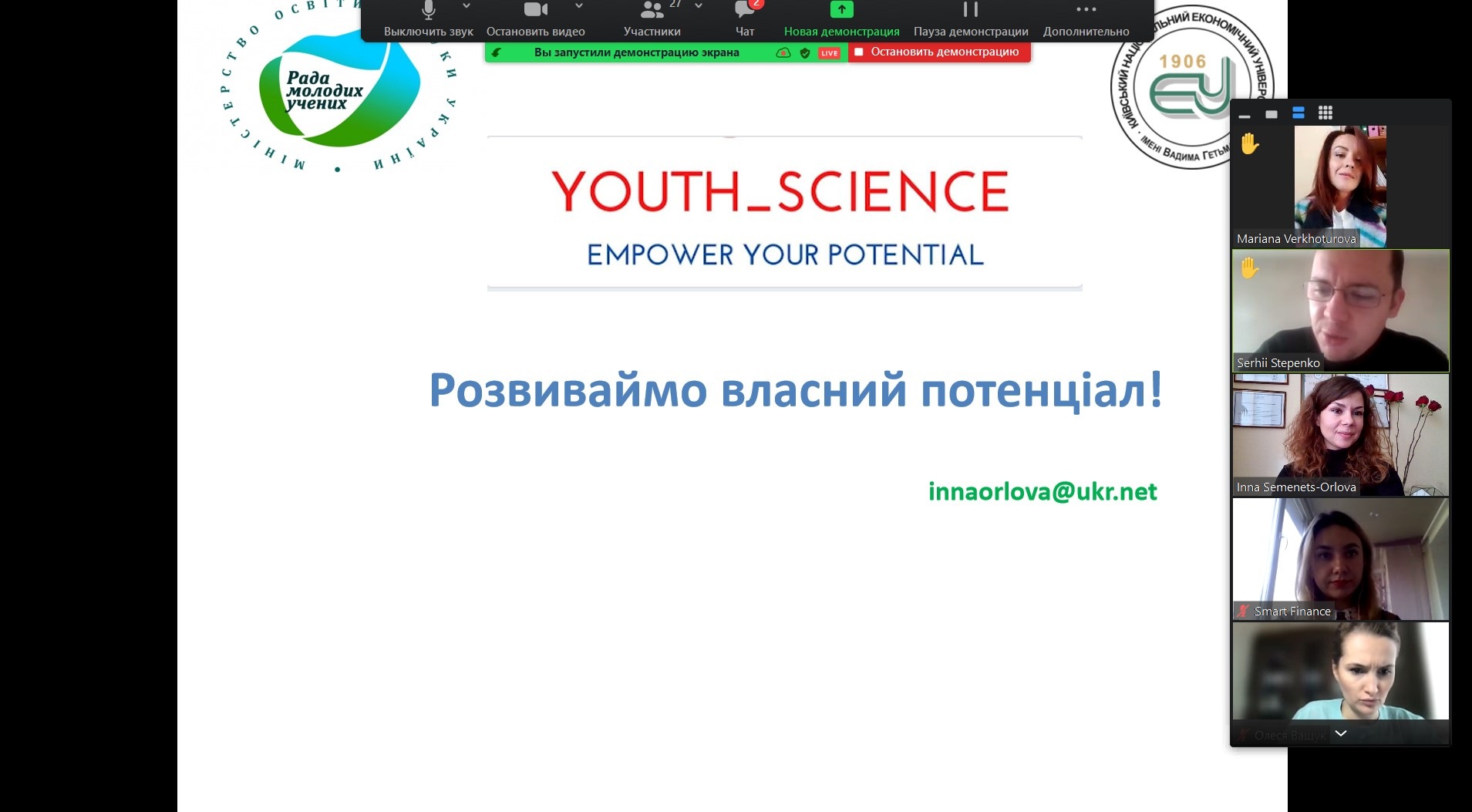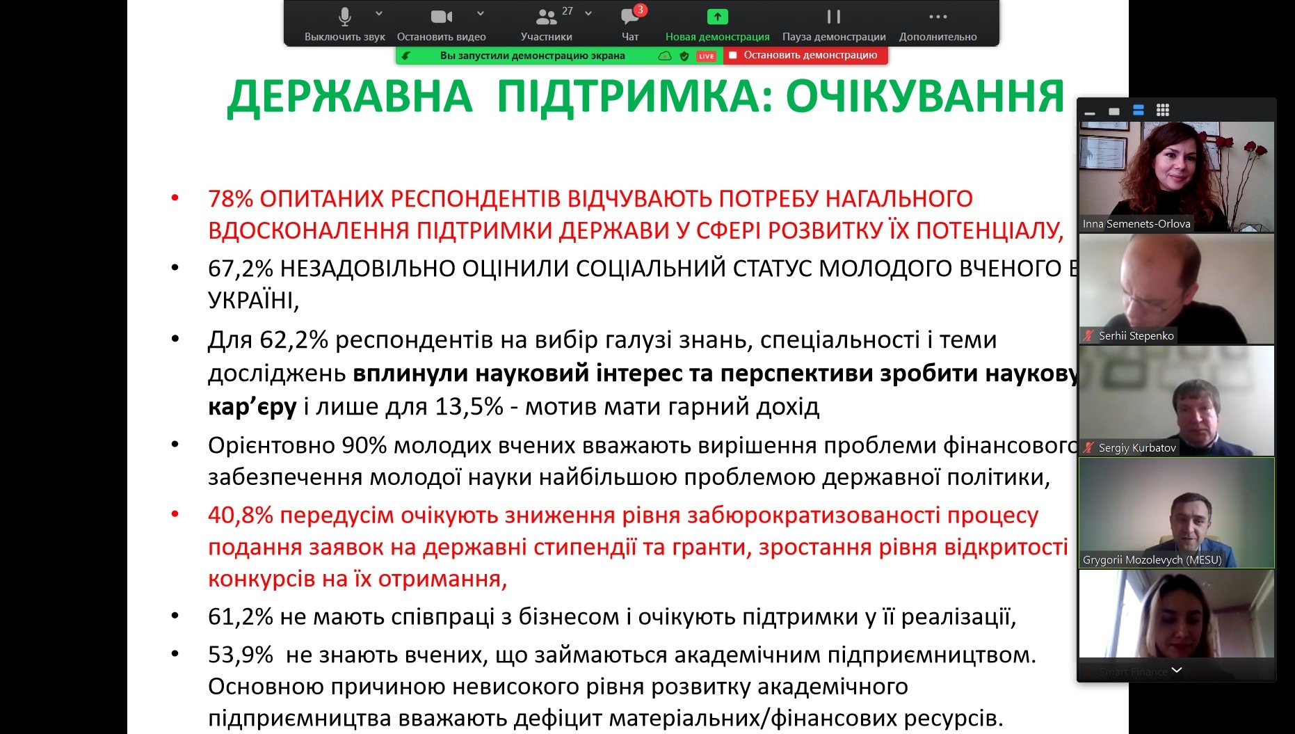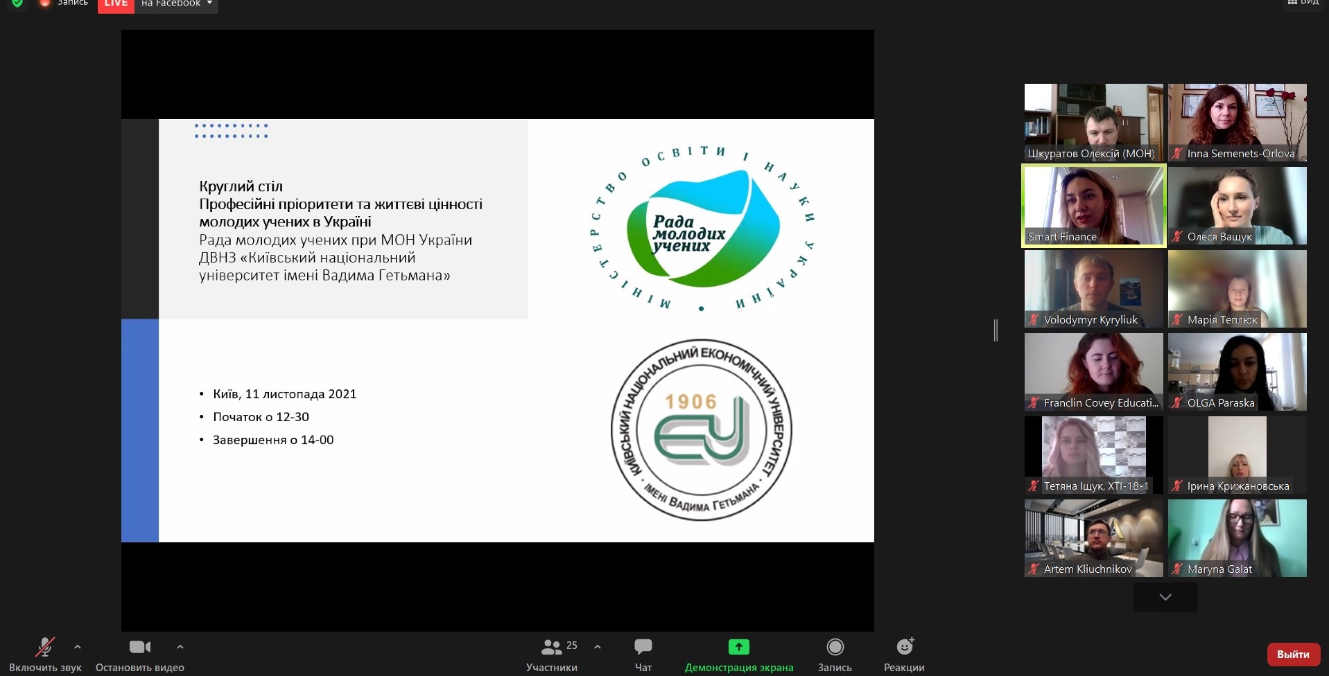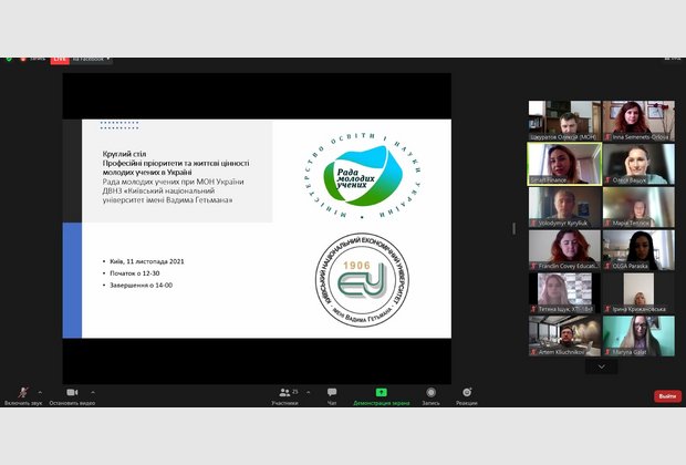 Директор ННІУЕБ Семенець-Орлова І.А. виступила з експертною доповіддю у ході круглого столу «Професійні пріоритети та життєві цінності молодих вчених в Україні», що відбувся11 листопада 2021 р. Захід був організований Радою молодих учених при Міністерстві освіти і науки України у співпраці із командою проєкту молодих вчених «Реалізація потенціалу молодих вчених в інтеграції науки, освіти, бізнесу» (державний номер 0120U102126). Проект виконується виконується молодими вченими Київського національного економічного університету імені Вадима Гетьмана, Міжрегіональної Академії управління персоналом та Інституту дослідження науково-технічного потенціалу та історії науки ім. Г.М. Доброва НАН України.