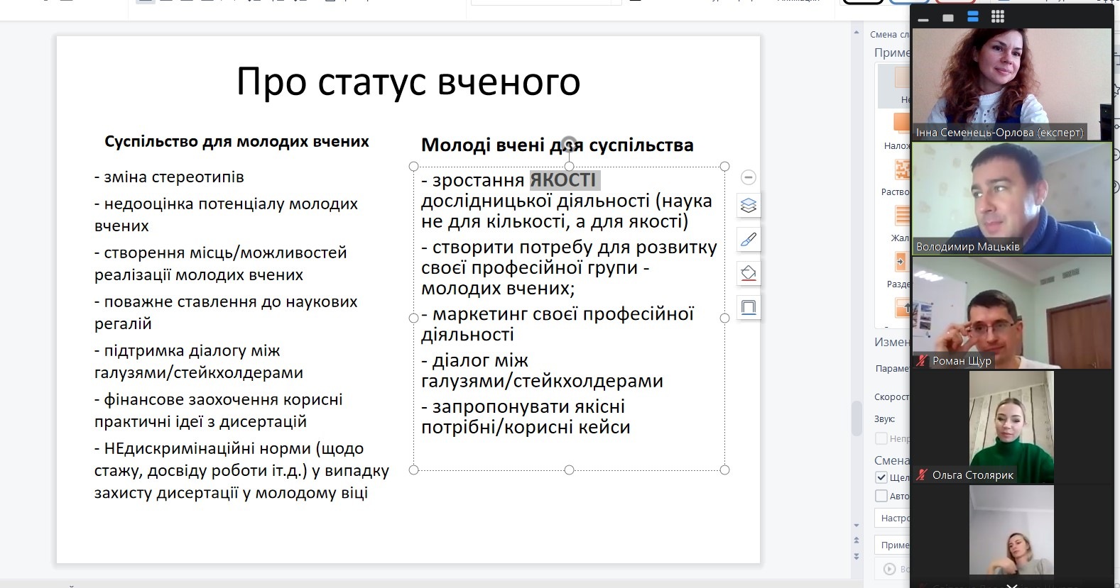 18 листопада директор ННІУЕБ Семенець-Орлова І.А. провела фокус-групу із молодими вченими з Львівського національного університету ім. І. Франка та Прикарпатського національного університету ім. В. Стефаника, що займаються дослідженнями на тему розбудови економіки та бізнесу. Молоді вчені продовжили ефективну співпрацю з дотриманням карантинних заходів. У рамках впровадження проекту “Реалізація потенціалу молодих вчених в інтеграції науки, освіти, бізнесу” (виконавець Київський національний економічний університет імені Вадима Гетьмана у співпраці з МАУП та НАНУ) дана фокус-група була планова, проведена в дистанційному форматі (в Zoom-середовищі). Тема заходу: “Реалізація особистісного та професійного потенціалу наукової молоді”. Учасники змогли висловити цікаві думки щодо нових можливостей розбудови спільноти молодих науковців в Україні.
