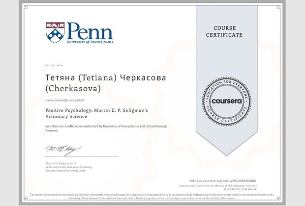 Старший викладач кафедри психології Хмельницького інституту МАУП Черкасова Тетяна Михайлівна пройшла міжнародне стажування з курсу «Позитивна психологія» Мартіна Селігмана, доктора психології, директора Центру позитивної психології Пенсильванського університету (США).